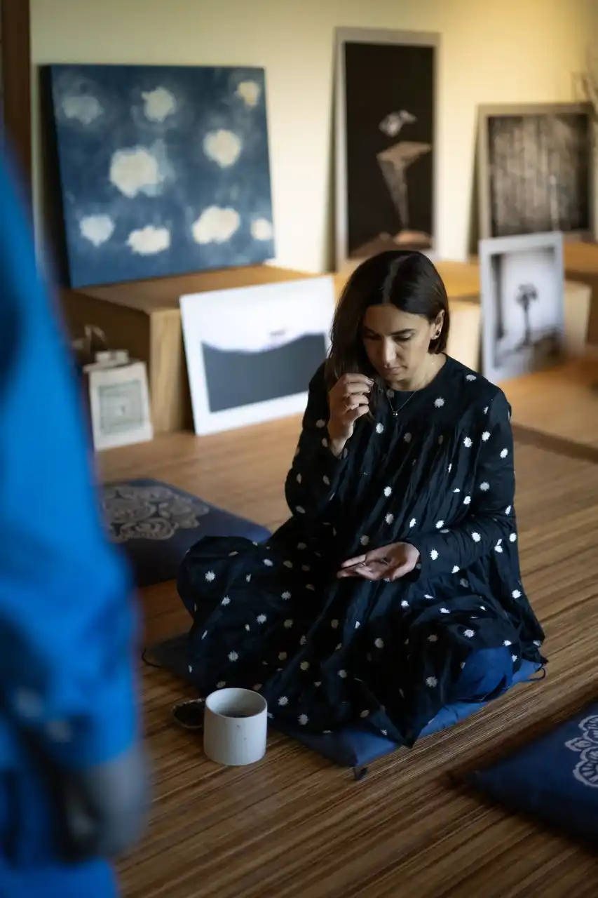 春風が心地よく巡る2025年5月、デザイナーのMarinaと京都の工房を訪れました。「京都の島原の外は染まるほど藍畑だらけだった」と書かれた松尾芭蕉の弟子(服部嵐雪)1700年の俳句や、「京洛外の藍は日本の藍の中で最も高品質」と記された1712年出版の日本の百科事典など、たくさんの貴重な書物とともに京藍について学び、松崎氏の深い知識にMarinaも興味津々で真剣に聞き入っていました。 |
