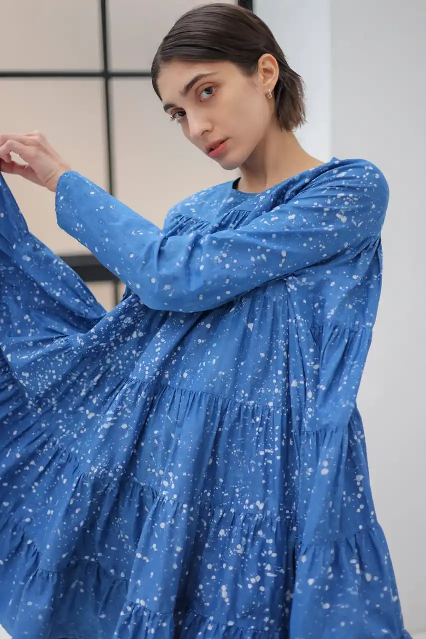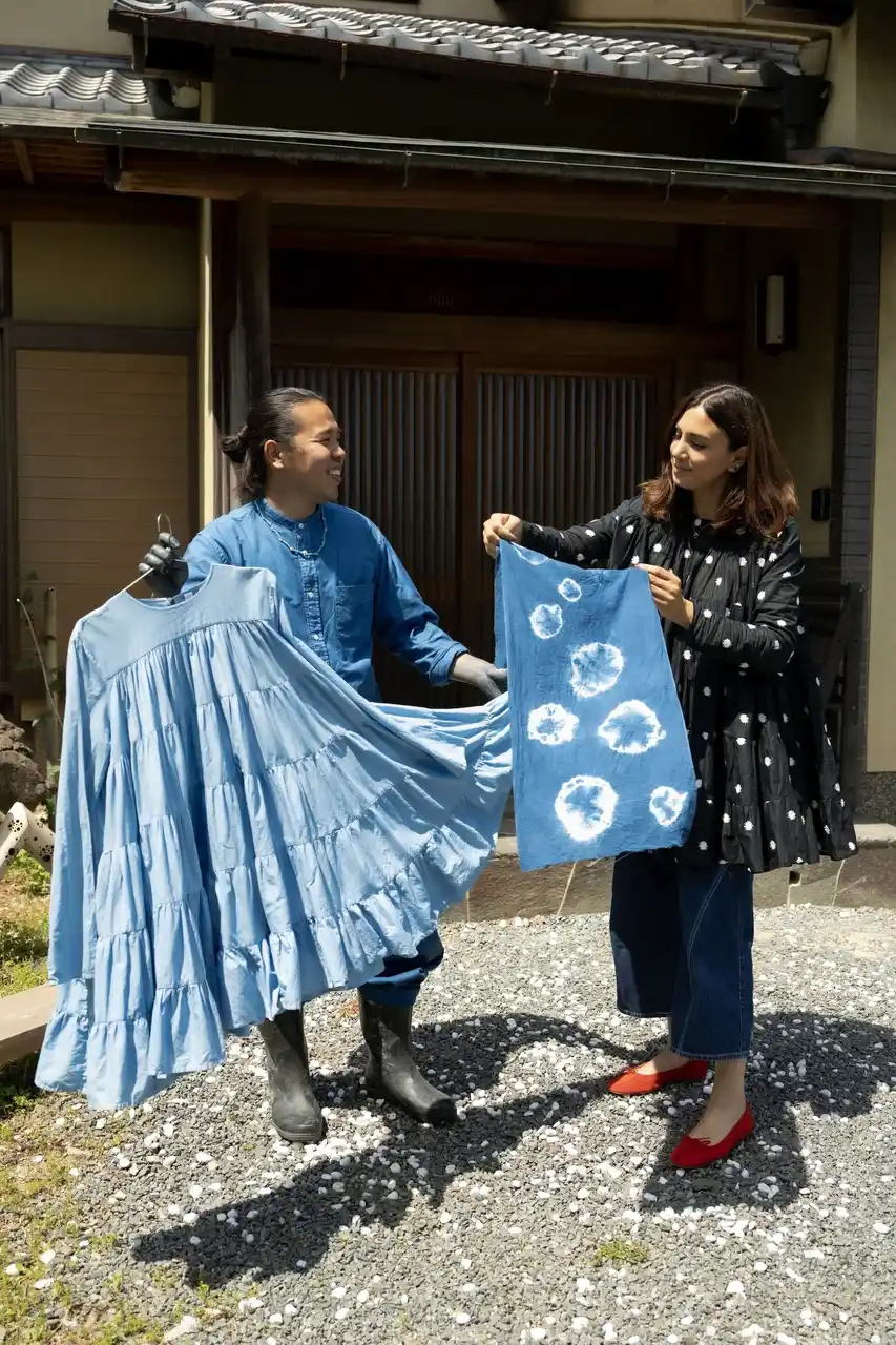 ニューヨークで“ジャパンブルー”に出会い、100年前(大正時代)に滅びてしまった京藍を復活させ、藍染のはじまりの地である地元京都・洛西で日本古来の植物で藍染をしているアーティストの松崎陸氏。OEKO-TEX(R)認証されたコットンやリネンなどの天然素材を毎シーズン使い続け生地ロスを減らすなど、サステナブルな生産背景を持つニューヨークブランド・マーレットのMarina。 |