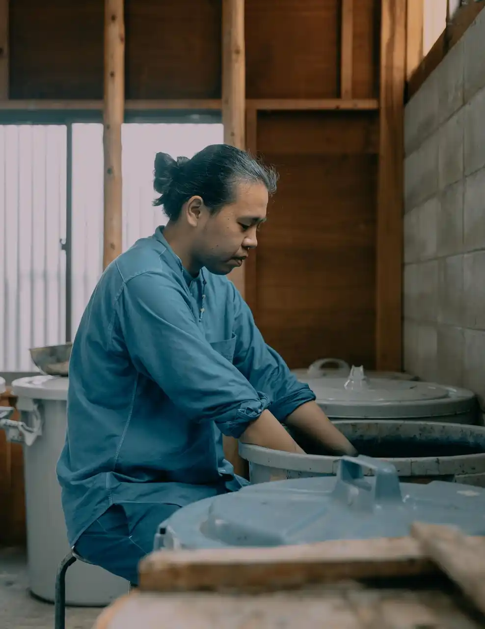 1990年京都市洛西生まれ。大学で経営学を専攻。22歳の時にニューヨークで“ジャパンブルー”に出合い藍染作家を目指すことを決意。2015年野村シルク博物館で養蚕、手織り、和装を学ぶ。17年染司よしおか五代当主吉岡幸雄氏に師事。18年正倉院宝物復元に携わる。20年約900坪の畑を借りて京藍の栽培を開始。21年染司よしおか独立。22年京都市西京区大原野に工房を開く。23年妙心寺桂春院で個展を開催し、作品「京藍壁観図」を奉納。24年「ヴァレクストラ」や「カンサイヤマモト」とのコラボレーション製品を発表。 https://matsuzakiriku.com/