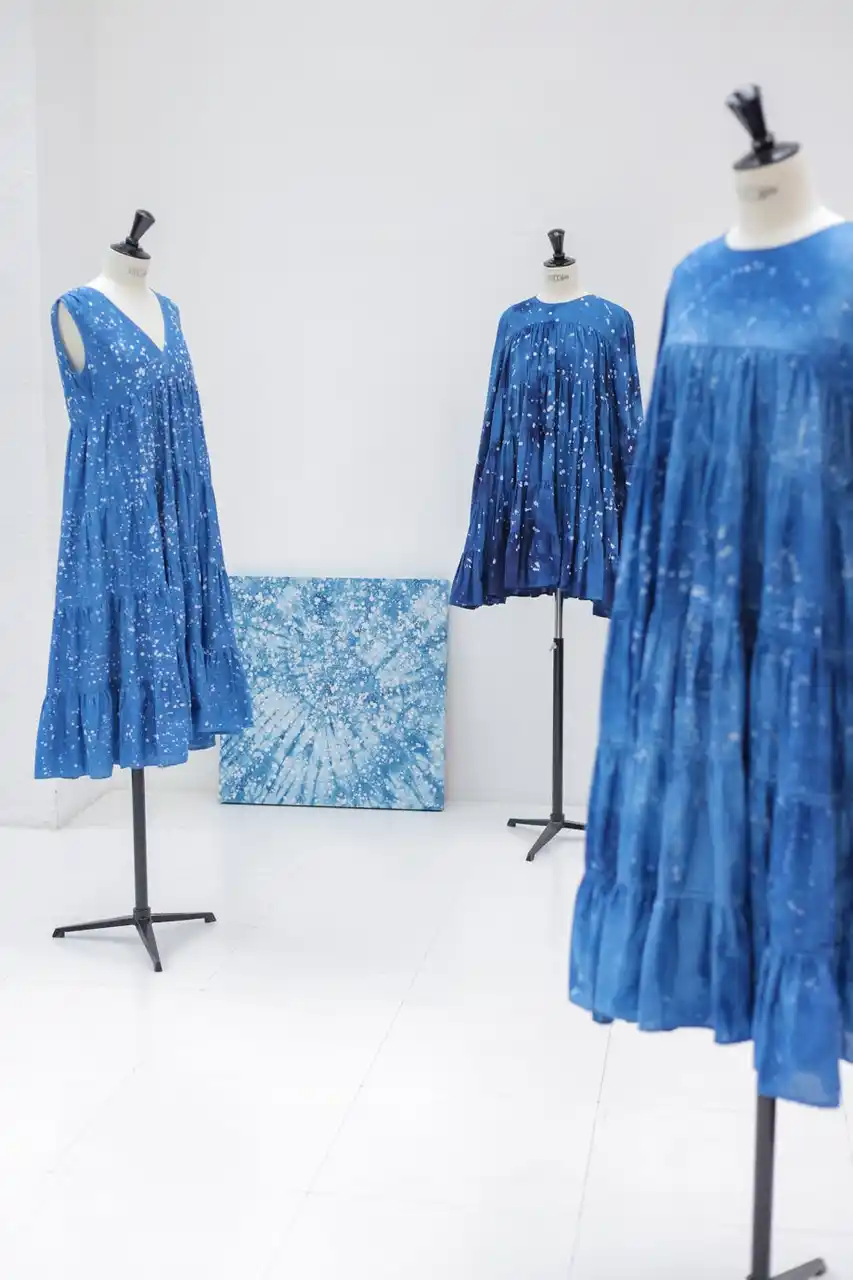 未来へつながるものづくりを大切にするふたりが出会い、互いに共鳴しうまれた特別なコレクションです。Merletteのホワイトコットンアイテムを700年前の技法で発酵させて染め上げたドレスを、10周年スペシャルピースとして伊勢丹新宿店リ・スタイルとロンハーマン六本木店で10型限定で販売いたします。 |