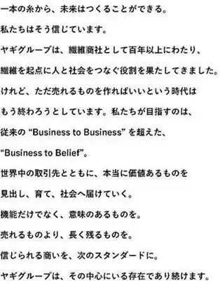 私たちの歩みを支えてきた「終始一誠意」と、新たに掲げる「Business to Belief」。これらは決して別個のものではなく、ヤギという企業を貫く一本の思想の線で結ばれています。 |