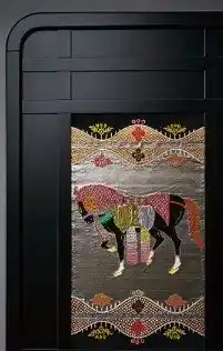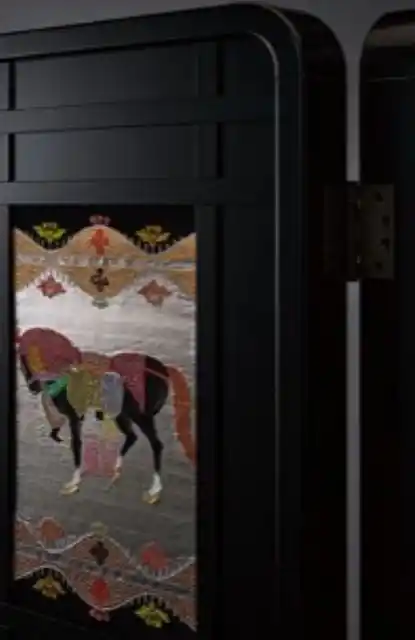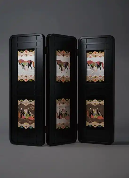 移動可能で、部屋のサイズに合わせて空間を自由に分割できる、機能的な家具である「屏風」。これは、「機能性と可動式のアート」とも言えます。ここに龍村の「美術織物」である「帯」を「移動可能なアート」として存在させたのです。 |