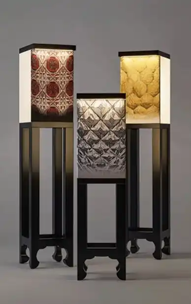 「行燈」は伝統的な日本のフロアライトです。直接的な強い光ではなく、間接的な「柔らかい光」は、陰影を伴う繊細な空間を作ります。日本の住宅は木造が主流で燃えやすかったため、火を保護しつつ、和紙を通して「柔らかい光」を演出した日本独自の手法であり、文化の1つだと考えます。その美意識はそのままに、人々がそのシーンを体感出来るよう、「行燈」の持つ柔らかい光と「美術織物(アート)の鑑賞」の共存をめざしました。 |