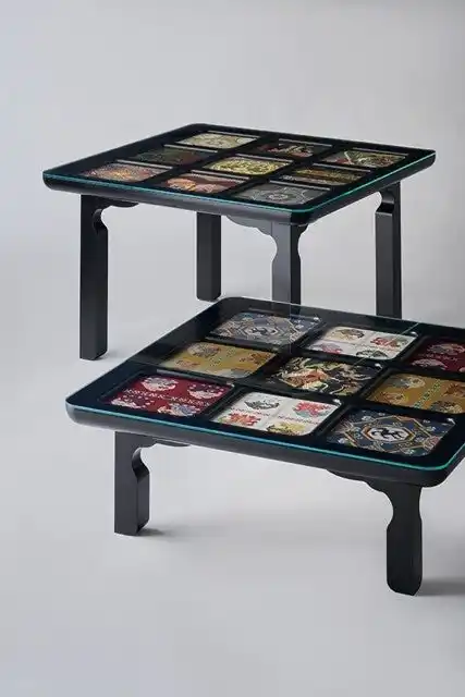 日本建築において最も格式の高い様式とされる「格天井」は、角材を正方形の格子状に組み、「格式とデザイン性」とを表現した天井です。その立体的な格子を天井ではなくテーブルに落とし込み、見上げるものであった「美意識と格式」を別の視点で楽しんで頂けるよう考慮しました。 |