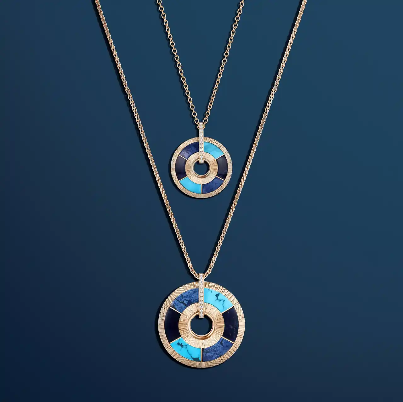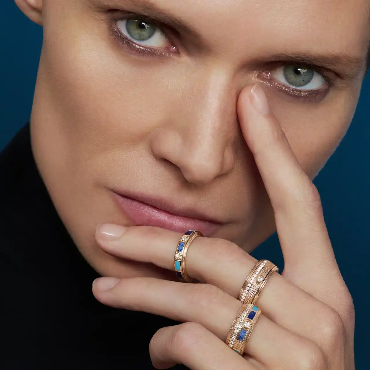 これらの生きた傑作では、石の質感、正方形や楕円形の多様なニュアンスの深さ、光の共鳴が絡み合い、絵画のように鮮やかで動きのあるコントラストを描きます。精巧にカットされた繊細なターコイズ、紺碧のソーダライト、そして魅力的なデュモルチェライトが、陶酔させるようなモザイクの中で調和して、作品を護符の地位に引き上げています。それぞれが、太古の昔から人々の想像力を魅了してきたお守りに呼応し、そのビジョンを蘇らせることで、ピアジェはジュエリーを守護石へと変貌させます。コレクションの美学は象徴性を親密に伝え、それぞれの輝くジュエリーに深い意味を込めています。多くの文化において繁栄と幸運の普遍的な象徴である環状のフォルムは、本質的に守護的な側面を持っています。 |