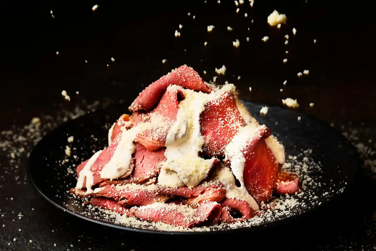 降り積もるチーズと禁断トリュフマヨのローストビーフスライス |