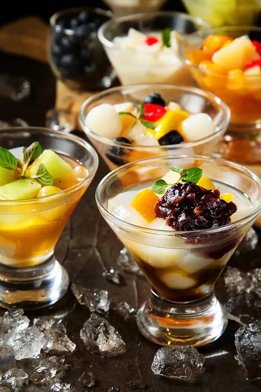 「罪を冷やす官能シェーブドアイス」は、スタッフが目の前でふわりと削り上げたプレーンかき氷をそのままゲストへ。きめ細やかな氷に、お好みのシロップやトッピングを自由に重ね、自分だけのアレンジでお楽しみいただけます。「甘さでリセットする悦楽フルーツポンチ」は、みずみずしいフルーツとやさしい甘さが特徴。お好みでトッピングを加えながら、背徳の宴を爽やかに締めくくります。 |