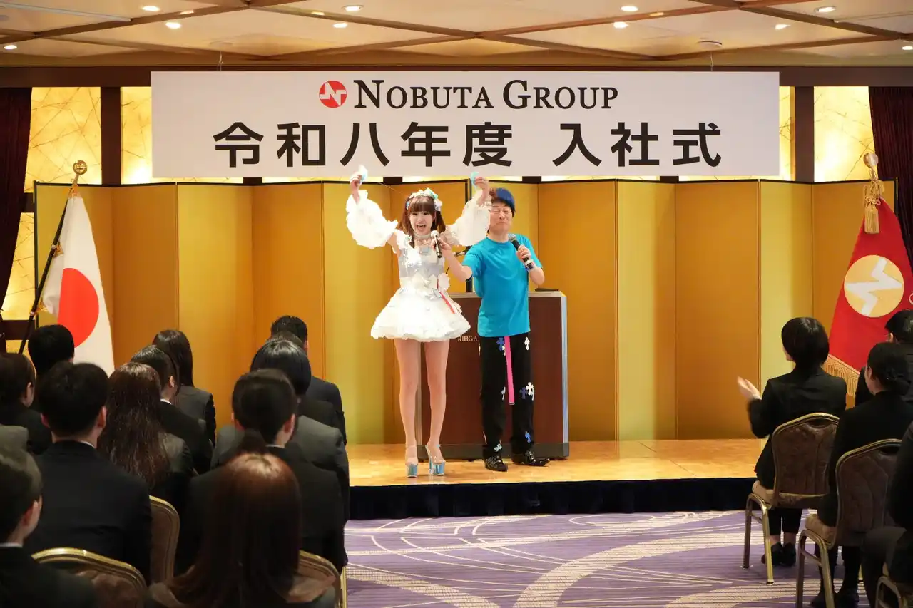 総合エンターテイメント事業を展開する株式会社 延田エンタープライズ(本社:大阪市中央区、代表取締役社長:延田尚弘、URL/https://www.nobuta123.co.jp)は2026年4月1日(水)に挙行した入社式において、漫才コンビ「かつみ(ハート)︎さゆり」さんをサプライズゲストに迎えました。張り詰めた緊張感を一瞬で笑顔に変えた、当日の様子をご報告いたします。 |