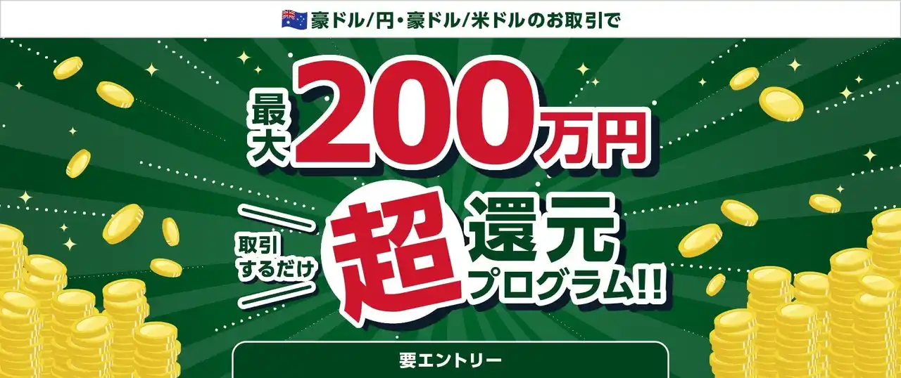 豪ドル/円・豪ドル/米ドルのお取引に応じて、最大200万円をキャッシュバックいたします。 |