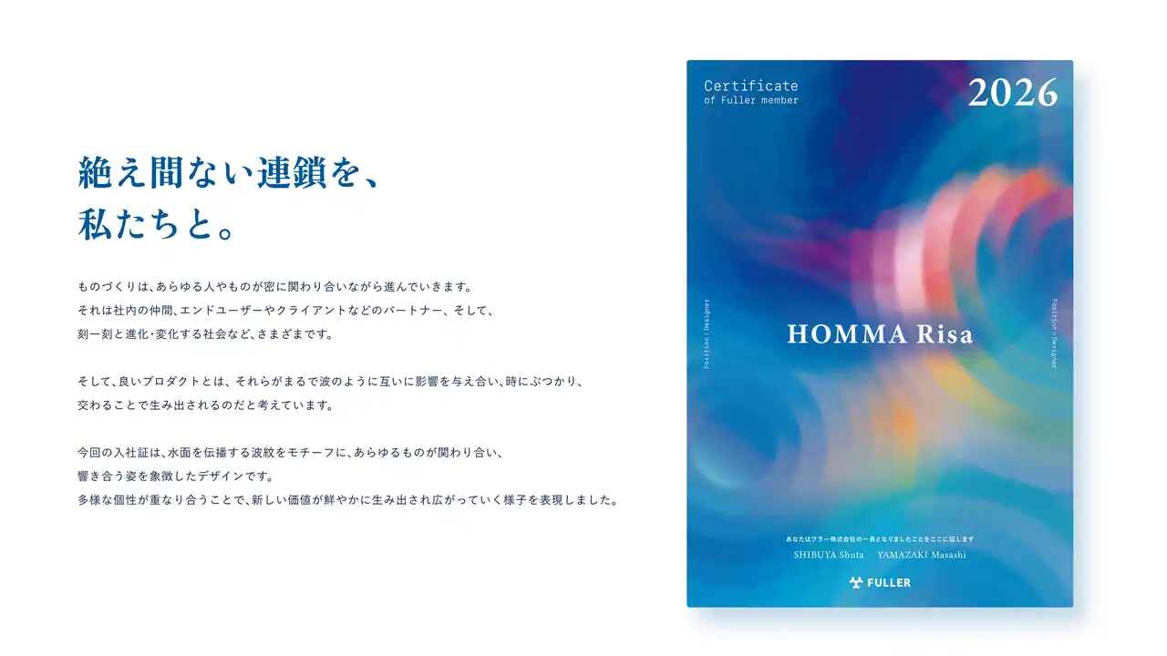 | 入社証はフラーのデザイナーがデザインを手がけました。“水面を伝播する波紋”をモチーフにしたデザインで、入社式では担当デザイナーが“入社証に込めた思いや願いを新入社員に向けて語りかけました。 | |||