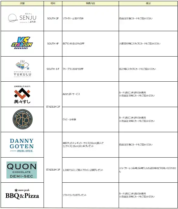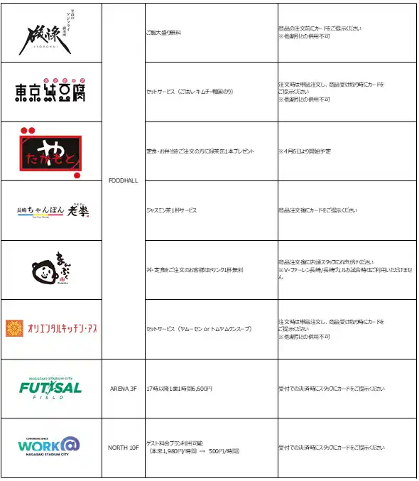 対象店舗において、三井住友カードのナンバーレスカード・Olive(オリーブ)をお持ちのお客様は優待特典を提供いたします。フードホール内の店舗以外にも、コンコースの飲食店など、長崎スタジアムシティ内のさまざまなショップで優待特典をご用意しております。 |