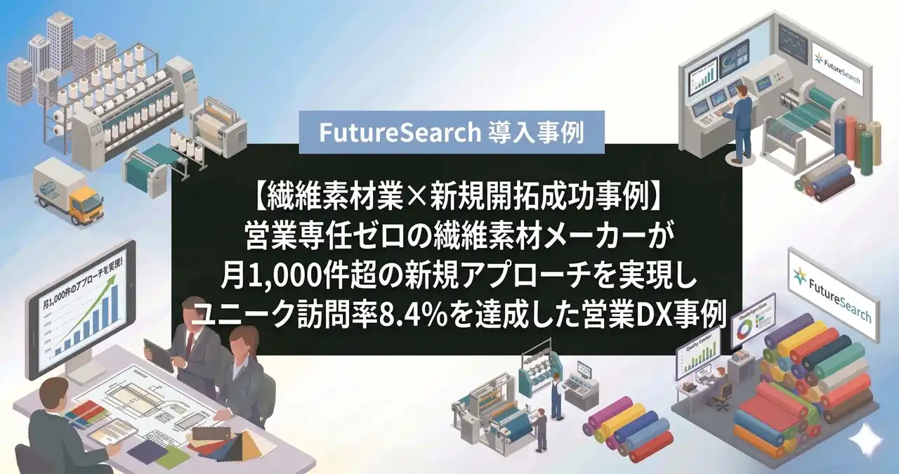 株式会社FUTUREWOODS(本社:東京都文京区、代表取締役:小浜勇人)は、BtoB営業支援ツール「FutureSearch(フューチャーサーチ)」を活用し、繊維素材メーカーC社が営業専任担当不在の体制で月1,000件超の新規アプローチとユニーク訪問率8.4%を達成した活用事例を公開しました。 |