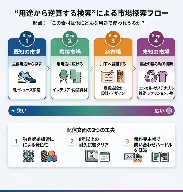 C社は用途から逆算してターゲットを探すアプローチを行いました。まず主要用途である「靴・シューズ製造」企業にアプローチした後、「インテリア・内装資材」「商業施設の設計・デザイン」と段階的にターゲットを拡大。さらに、リサイクル素材の強みを活かし「エシカル」「サステナブル」をキーワードに業種横断の検索も実施しました。 |