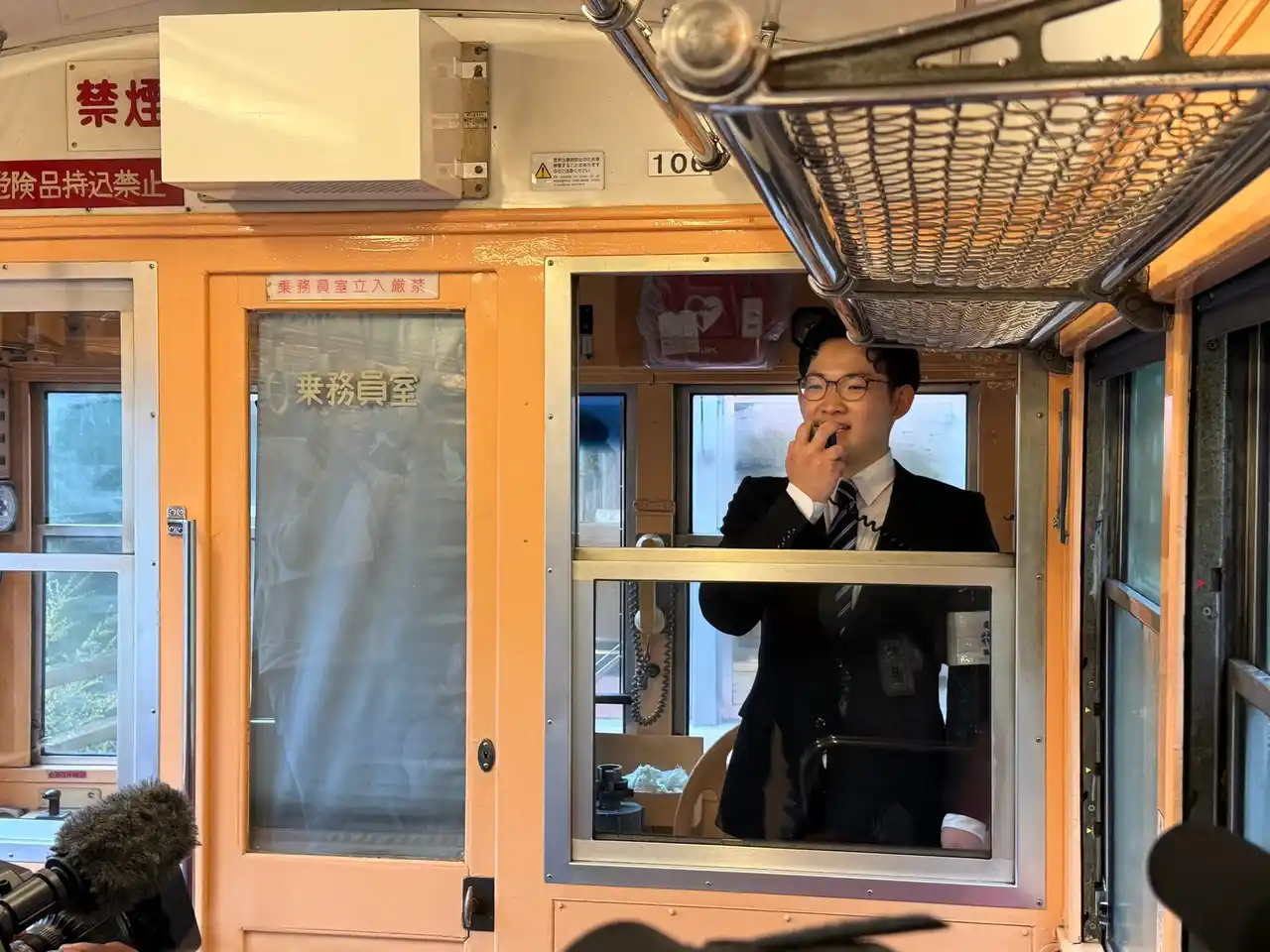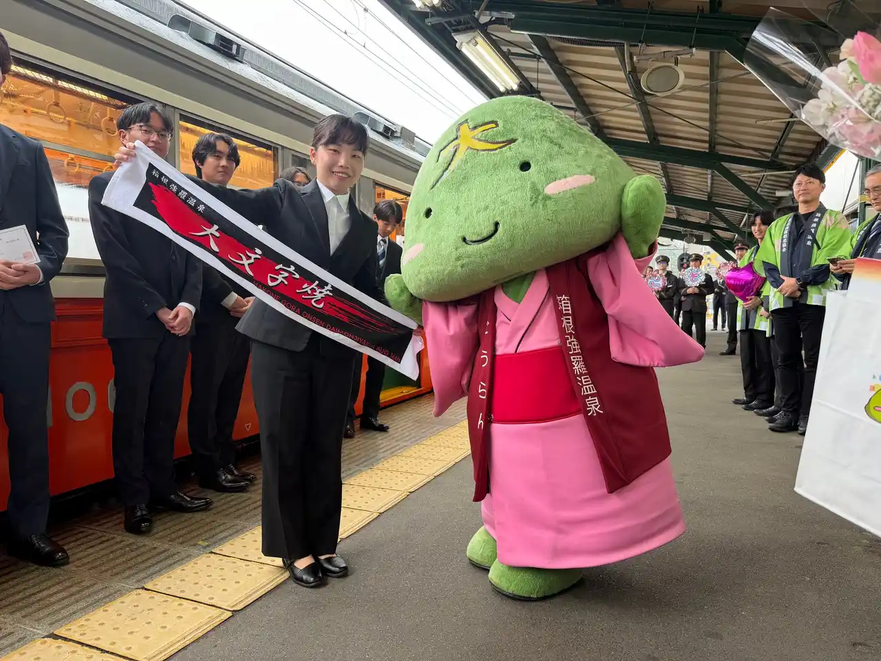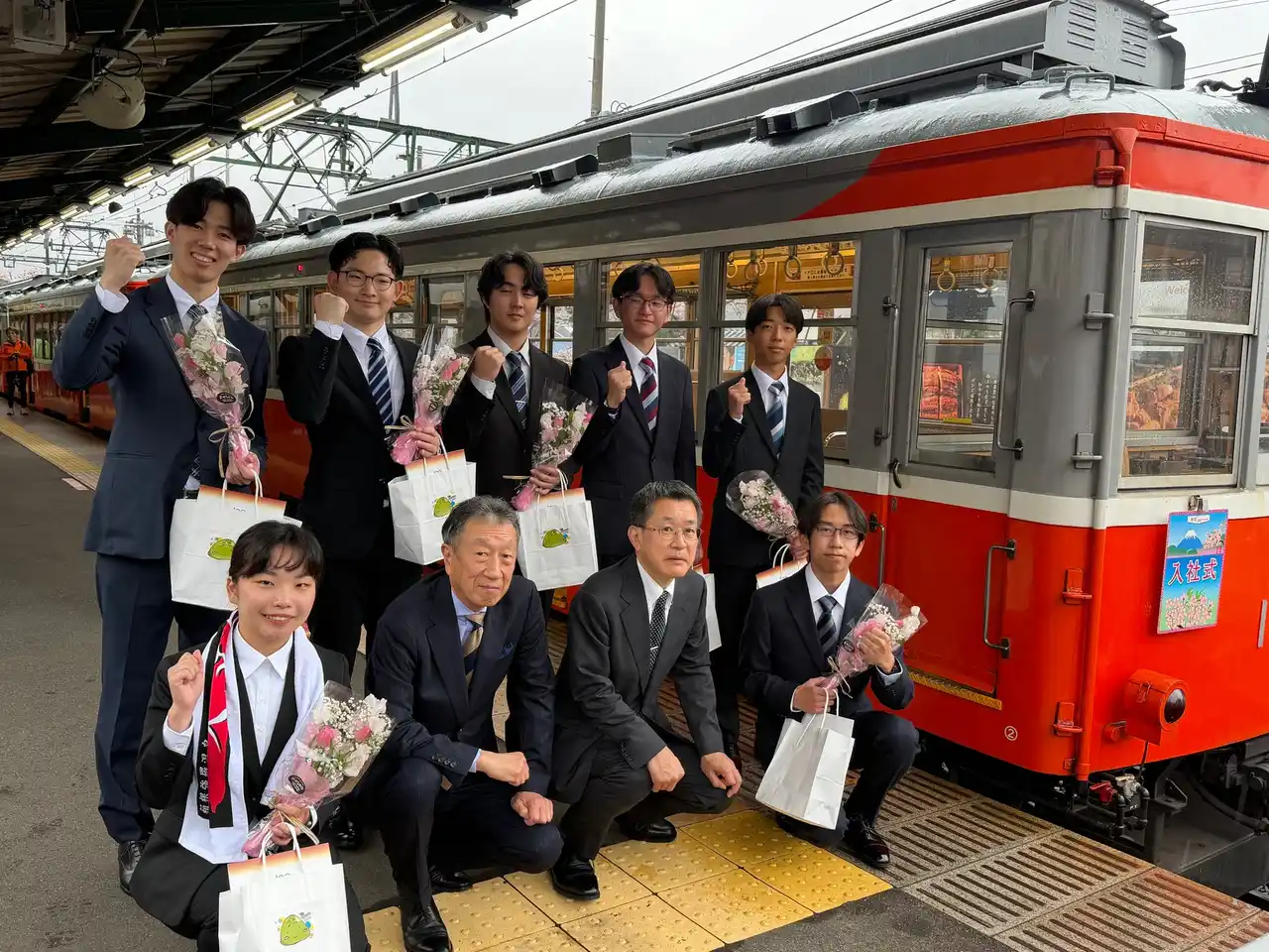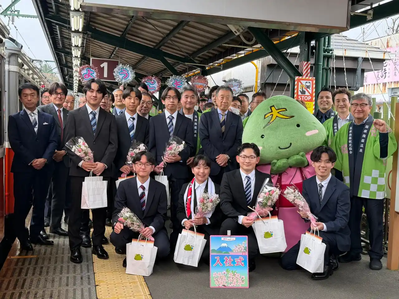 昭和の趣きを残す歴史的な100形の車内で入社式を行い、新入社員たちは緊張した様子もありながら、車窓に流れる春の箱根を感じ、新たな社会人としての決意を胸に刻みました。箱根湯本駅では駅係員から温かく見送られ、強羅駅では箱根強羅観光協会のマスコットキャラクター「ごうらん」や協会の方々から記念品贈呈などの歓迎をいただくなど、新世代の未来への門出の祝福を受けました。 |