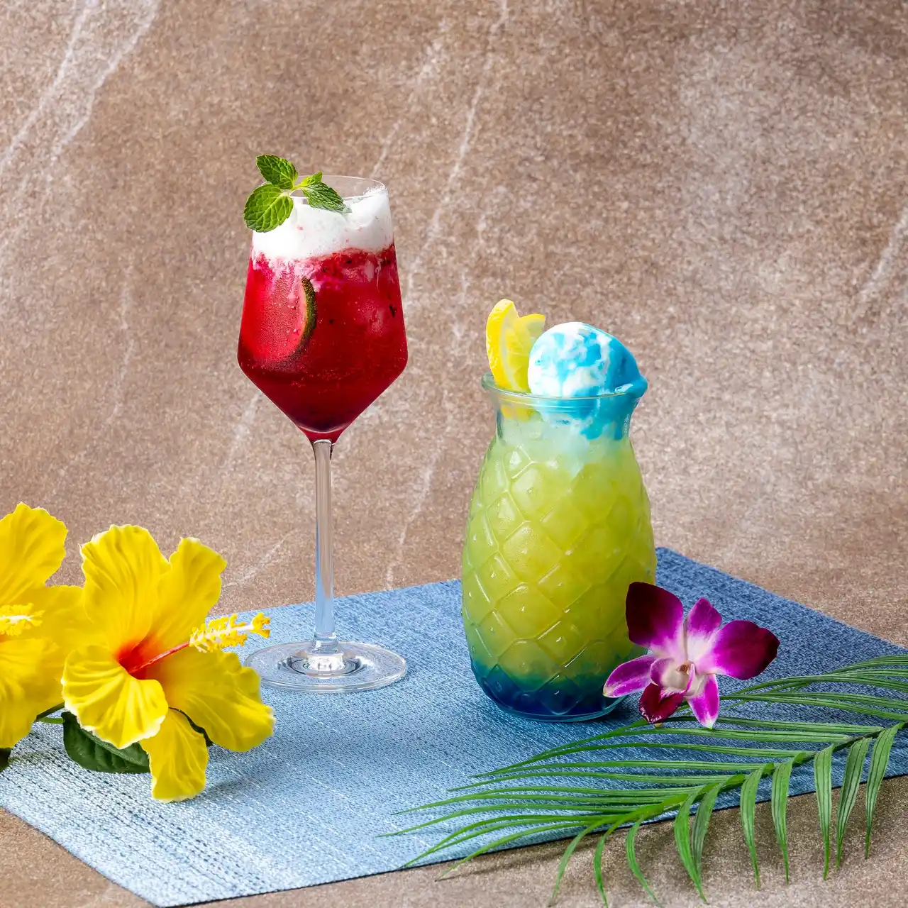 〈写真右〉ハイサイ トロピカル (ノンアルコールカクテル) ¥1,280 Haisai Toropical 沖縄の挨拶「ハイサイ」の名をつけたトロピカルカクテル。 パインとグァバの甘味にヴィネガーの爽やかな酸味を合わせ、 ブルーシールアイスをのせた南国らしい一杯。 |