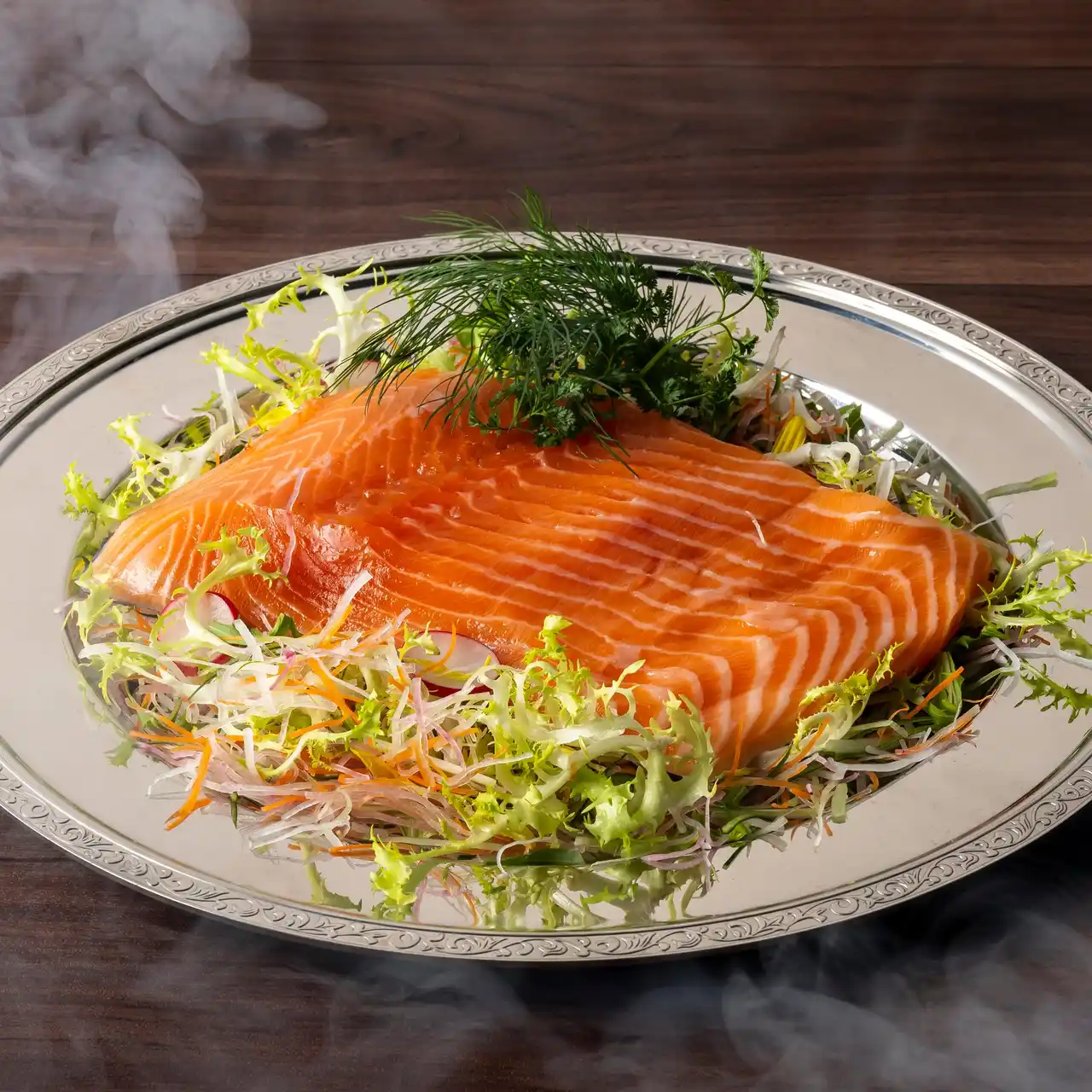 【シェフおすすめの一皿】沖縄県産黒糖でマリネしたノルウェーサーモンの軽い燻製 シークヮーサー香るグリーンペッパーソース |