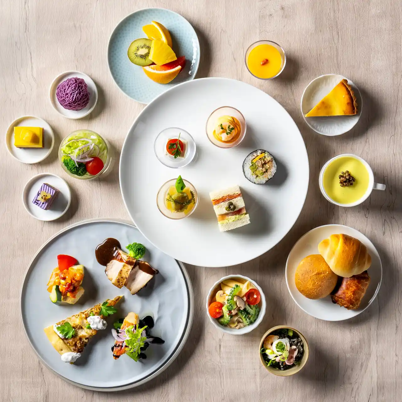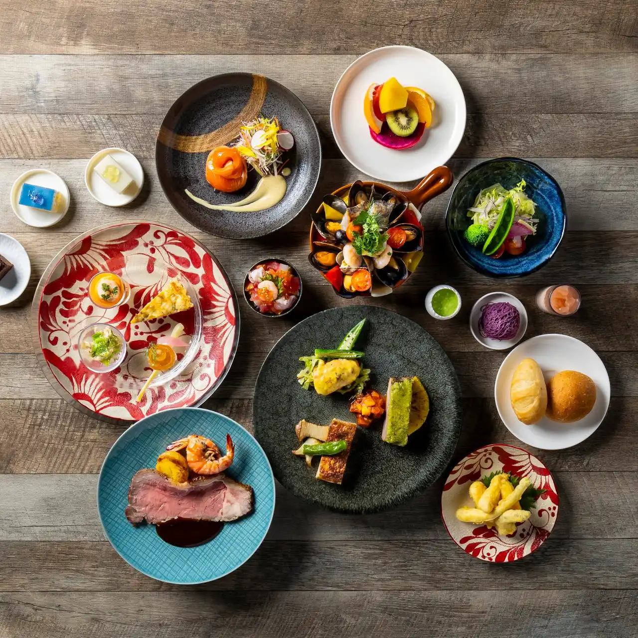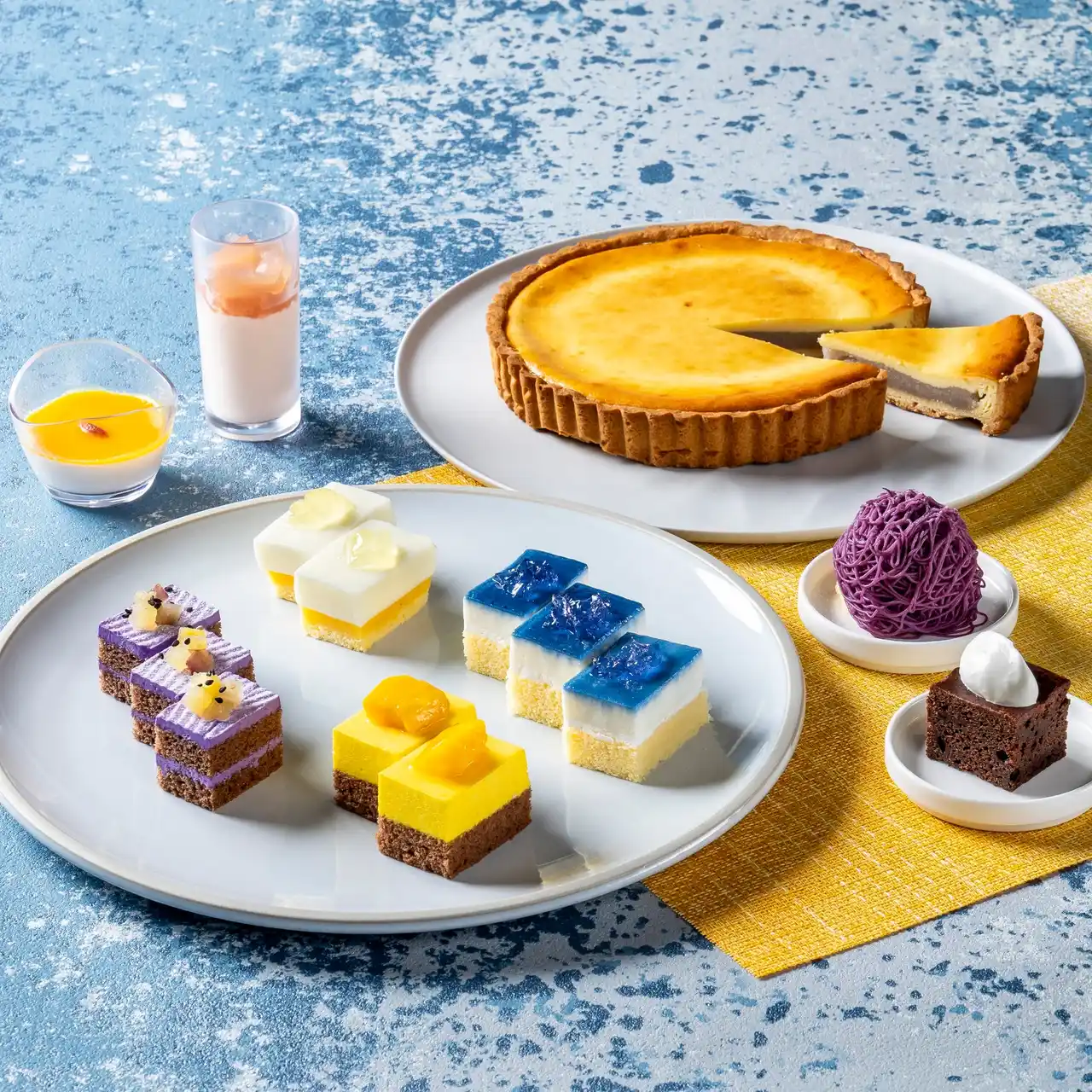 本フェアでは、旬の食材と沖縄の食文化を掛け合わせた、オリジナリティあふれるブッフェが登場します。定番の沖縄料理に新たなアレンジを施した「チキナーチャンプルー ガパオ風」や「タコライスの海苔巻き仕立て」など、伝統と遊び心を融合させた創作沖縄料理が並びます。スイーツにも沖縄の魅力を凝縮した「田芋のチーズケーキ」「黒糖ジーマミーアイス」「紅芋の生絞りモンブラン」など、素材の個性を生かしたラインアップをご用意。ディナーでは、シェフおすすめの一皿として「沖縄県産黒糖でマリネしたノルウェーサーモンの軽い燻製」を提供。やさしい甘みと燻香が調和した、フェアを象徴する逸品です。 |