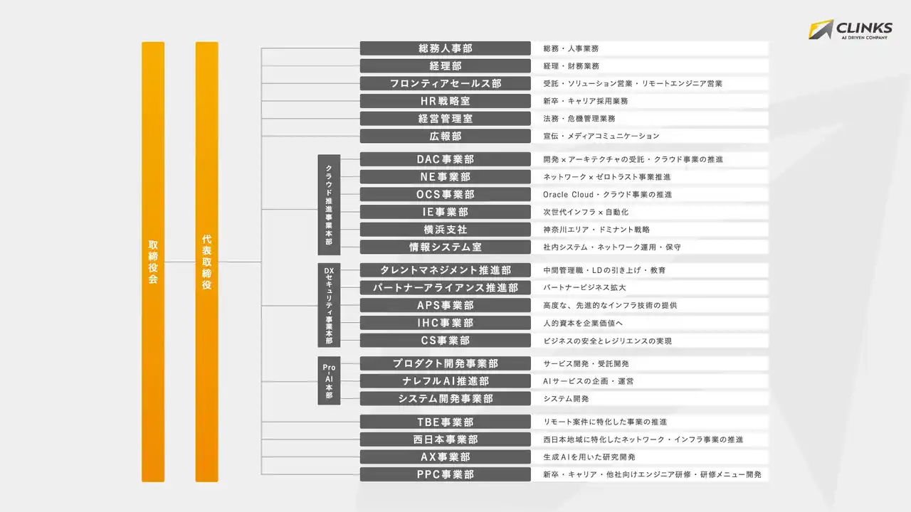 | AIサービスやシステム開発を手掛けるCLINKS株式会社(本社:東京都中央区、代表取締役:河原浩介)は、2026年4月1日(水)付で組織改編を実施いたしましたので、お知らせいたします。 | |||