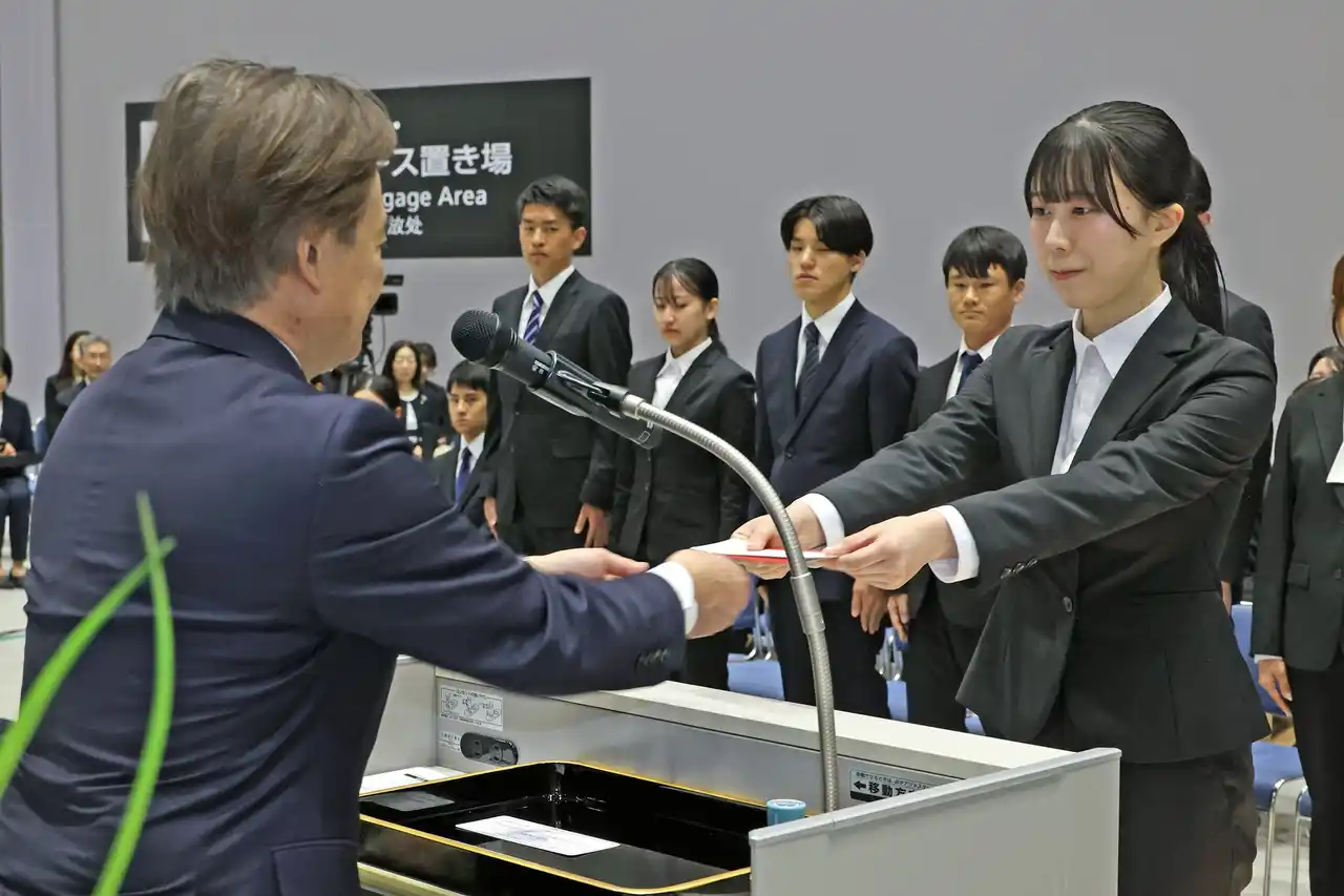 | 新入社員による決意表明では、セントレアグループ各社を代表する3名が社長の前に進み、「空港は旅の出発点であり、多くの人の思い出や再会が生まれる魅力的な場所。そのような場所で働けることに誇りを持ち、社会人としての責任を自覚しながら日々の業務に取り組んでいきたい。これからは仲間とともに成長し、切磋琢磨しながら、空港を支える一員として精一杯努めてまいります。」などと抱負を述べました。 | ||||||||||||||||||