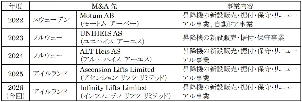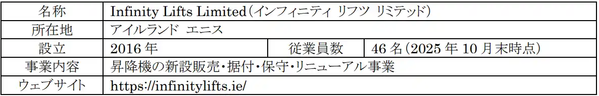今回の買収は、2025年4月のAscension Lifts社に続くアイルランドでの2件目の買収となります。本買収により、Ascension Lifts社が長年培った他社製品の据付・保守技術や首都ダブリンにおける顧客基盤に、当社製品にも精通したInfinity Lifts社が有する高度な技術力や同国内での広範な販売網を掛け合わせることで、幅広いお客様に対してメーカーを問わないあらゆるニーズにワンストップで応える体制の構築を目指します。この両社のシナジーを通じて、アイルランドにおける安定的な事業基盤を強化するとともに、欧州全体の昇降機事業の拡大戦略を推進します。 |