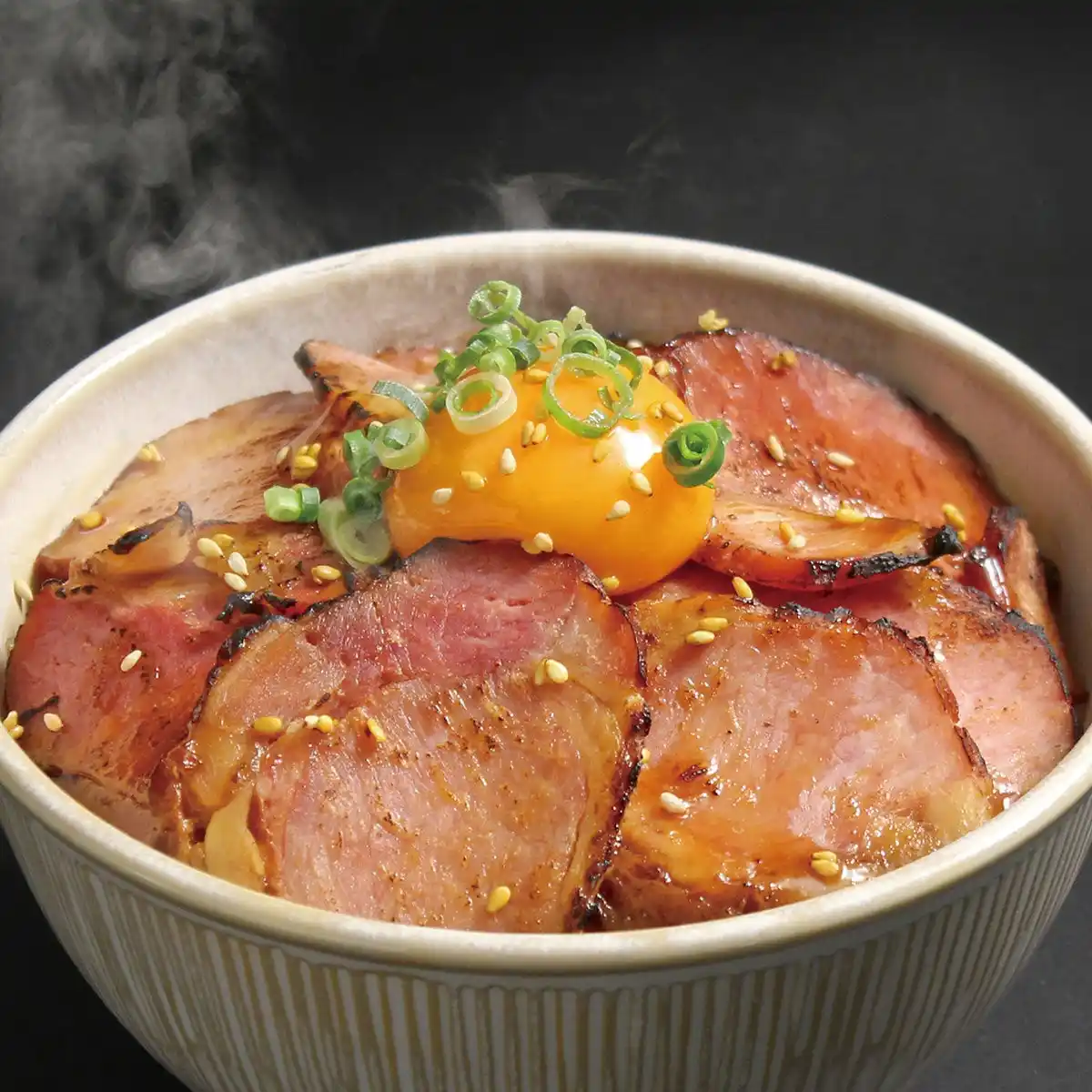 鹿児島県産豚モモ肉を使用し、鹿児島県の老舗醸造メーカーの特注秘伝だれに3日間じっくり漬け込みました。直火焼きロースターで約3時間、余分な脂を落としながら丁寧に焼きあげ、肉の旨味を最大限に引き出しています。スライス幅は肉の食感を活かす約4mm厚に仕上げました。 |