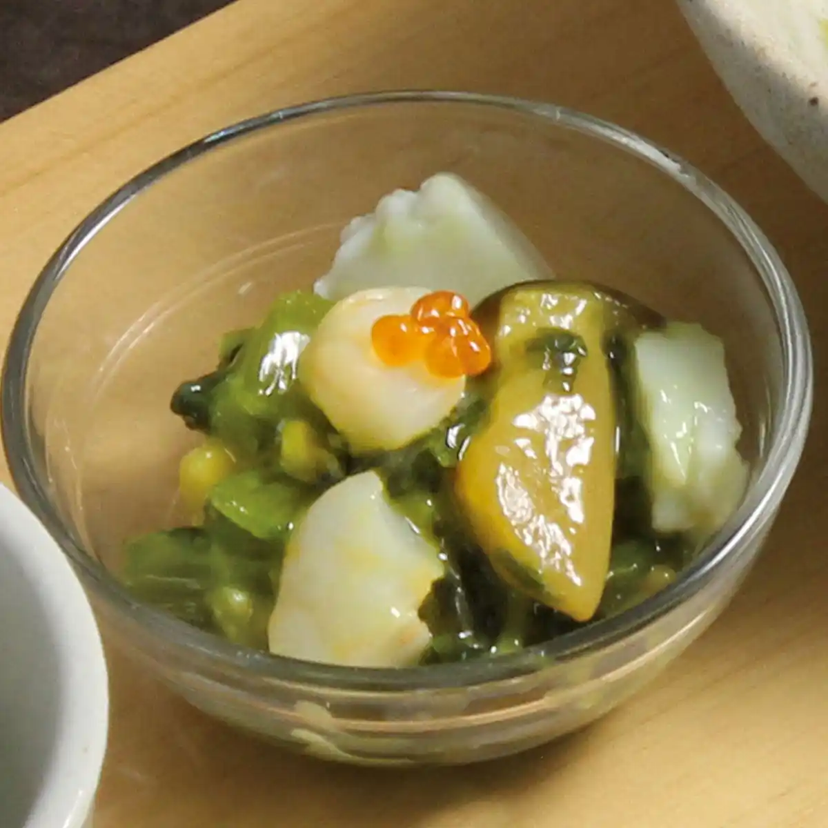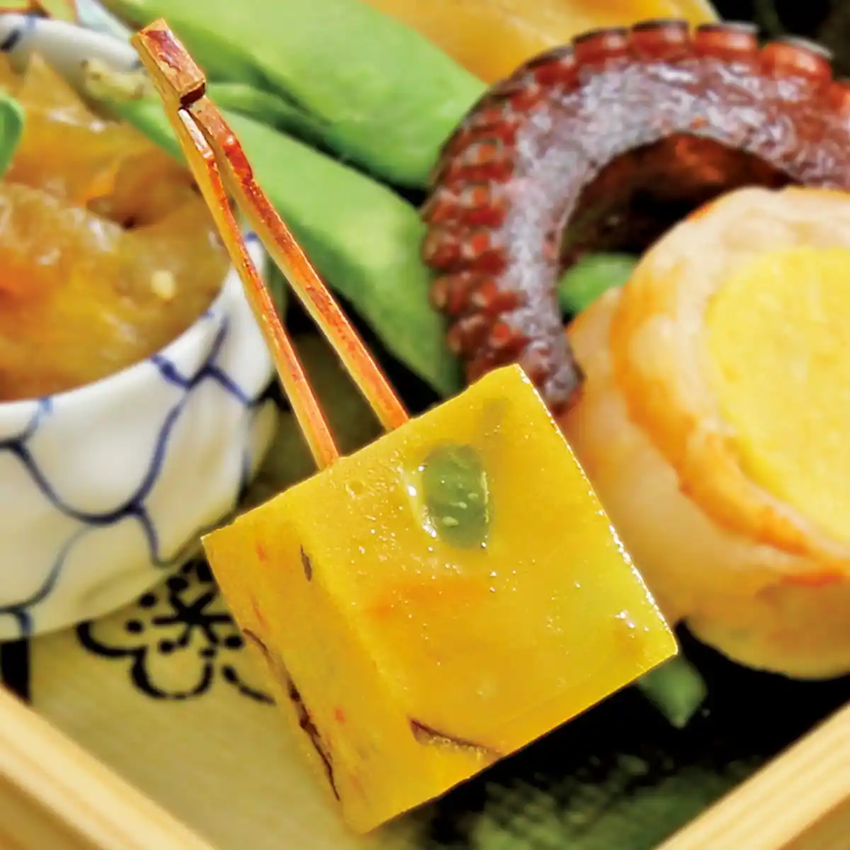 鶏肉を柚子胡椒と味噌ベースで味付けし、卵黄生地とともに蒸し上げました。柚子胡椒のピリッとした刺激が良いアクセントです。蒸し・カット・串打ちまで行ってあるため、解凍後そのまま前菜の一品としてご使用いただけます。 |
