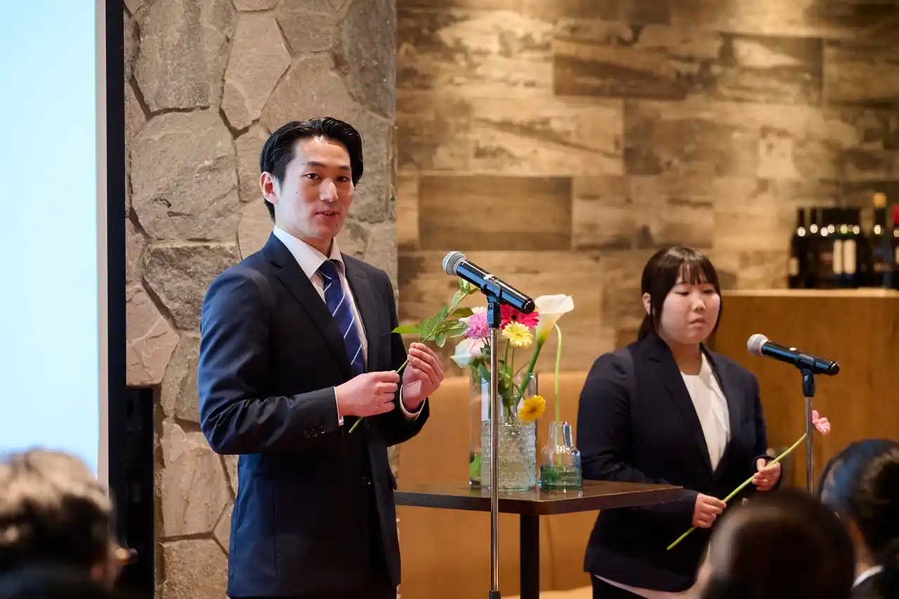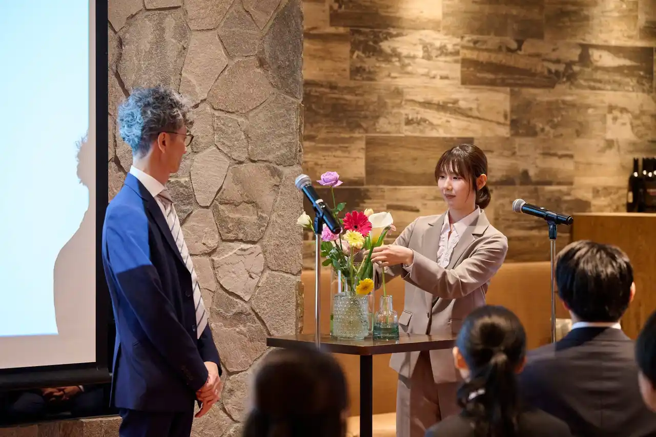 ファイントゥデイ社員の第一歩として、新入社員は経営陣とともに、草花を用いて美しさの本質に向き合うセッションを行いました。各自が大切にしている想いや価値観を表す草花を手に、それぞれが考える美しさを双方向で語り合いました。 新入社員からは「仕事は一人では完結できない。他の花と一緒に飾ることでその良さが活きてくるアンスリウムのように、周囲の支えに感謝しながら何事も挑んでいきたい」や「白いバラの花言葉「尊敬、尊重」のように、多様な価値観を尊重し、固定観念にとらわれない姿勢を大切にしていきたい」といった抱負が述べられました。 |