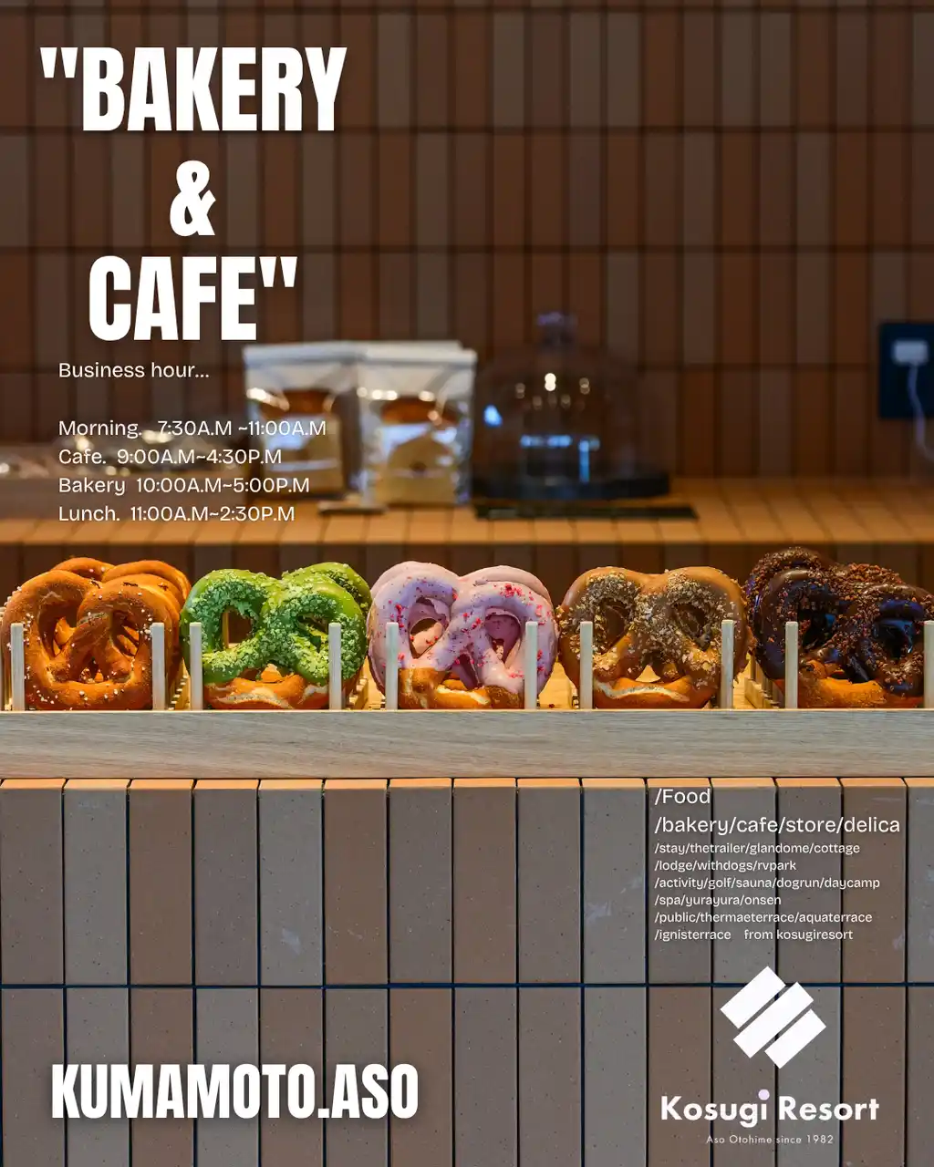 Kosugi Resort内のBakery&Cafe(ベーカリー&カフェ)では、熊本県南阿蘇で愛された「パンダイゴ」のベーカリーシェフ:上道大吾 氏が手掛ける素材や製法にこだわった商品づくりを行っています。プレッツェルもその代表的な人気商品です。生地から丁寧に仕上げる本格製法により、外は香ばしく中はもっちりとした食感を実現。イベント期間中はこうしたこだわりの味わいをベースにした限定商品も展開し、リゾートならではのグルメ体験を提供します。 |