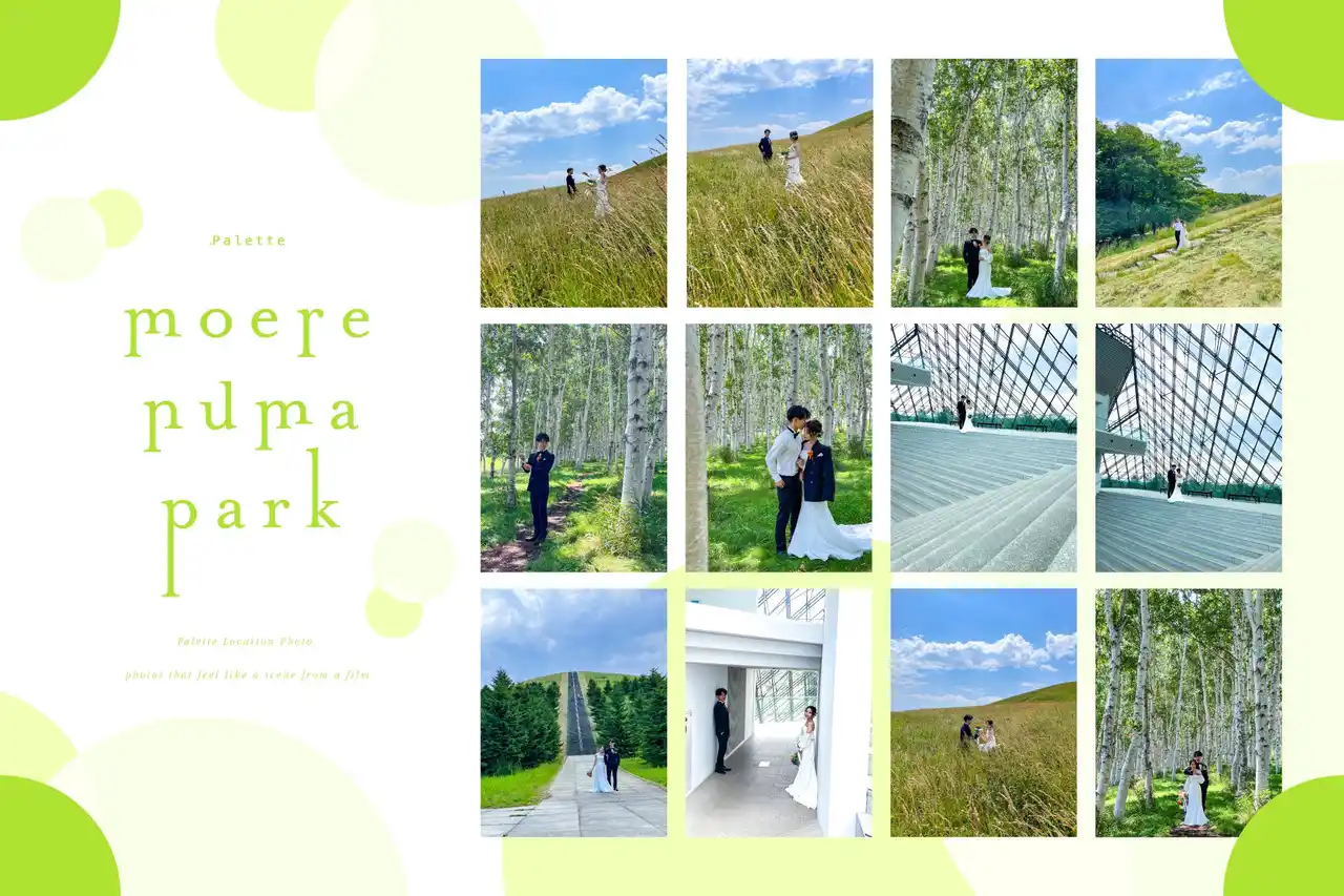 モエレ沼公園は、広大な草原や白樺林、ガラスのピラミッドなど、多様な表情を持つロケーションが特徴です。 |