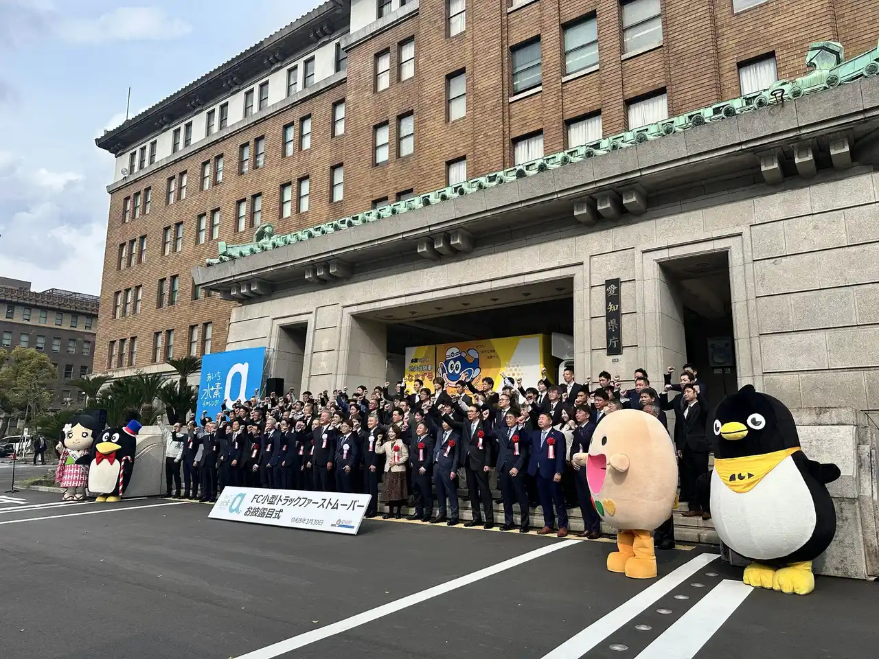 FC小型トラックファーストムーバーお披露目式にて、愛知県庁前での記念撮影の様子 |