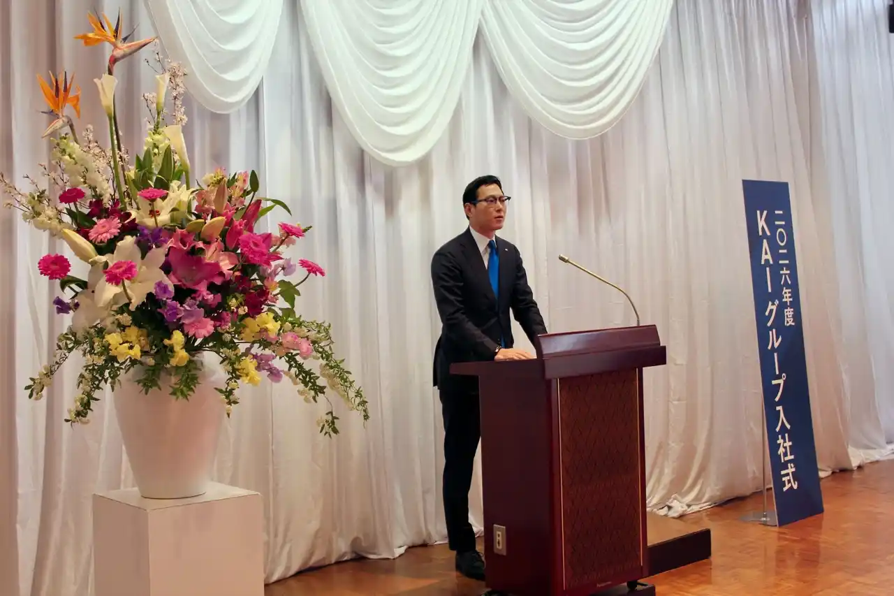 | 1年は短く、新入社員としての1年もあっという間に過ぎていきます。ぜひ1日1日をしっかりと積み重ね、これから一緒にKAIグループのさらなる成長・発展を支えていただけるようお願い申し上げまして、私からの皆さんに対する入社の歓迎の挨拶に代えさせていただきます。改めまして、ご入社おめでとうございます。 | |||