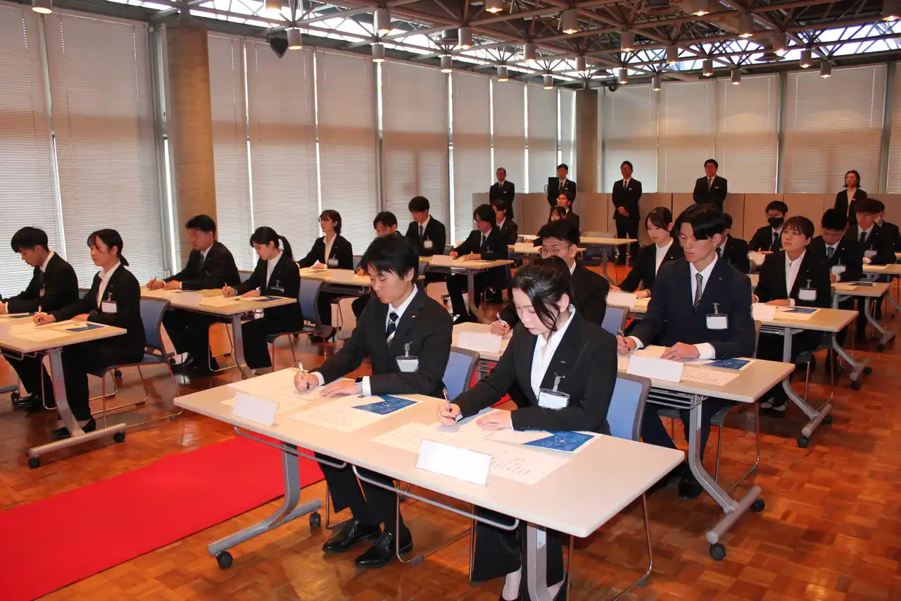 | その後、新入社員を代表して総合職の中西 春平が挨拶し、誓いの言葉を力強く宣言しました。新入社員への歓迎の言葉では入社2年目の先輩社員、生産・調達本部 技術部 刃物技術の前原 大和が登壇し、自身の経験から新入社員へのアドバイスや激励の言葉を贈りました。 | |||