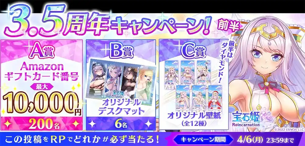 | 『宝石姫 Reincarnation』3.5周年を記念して、最大1万円分のAmazonギフトカード番号、オリジナルグッズ、オリジナル壁紙等が抽選で当たる?!ハズレなしの超豪華なRPキャンペーンを開催! | |||