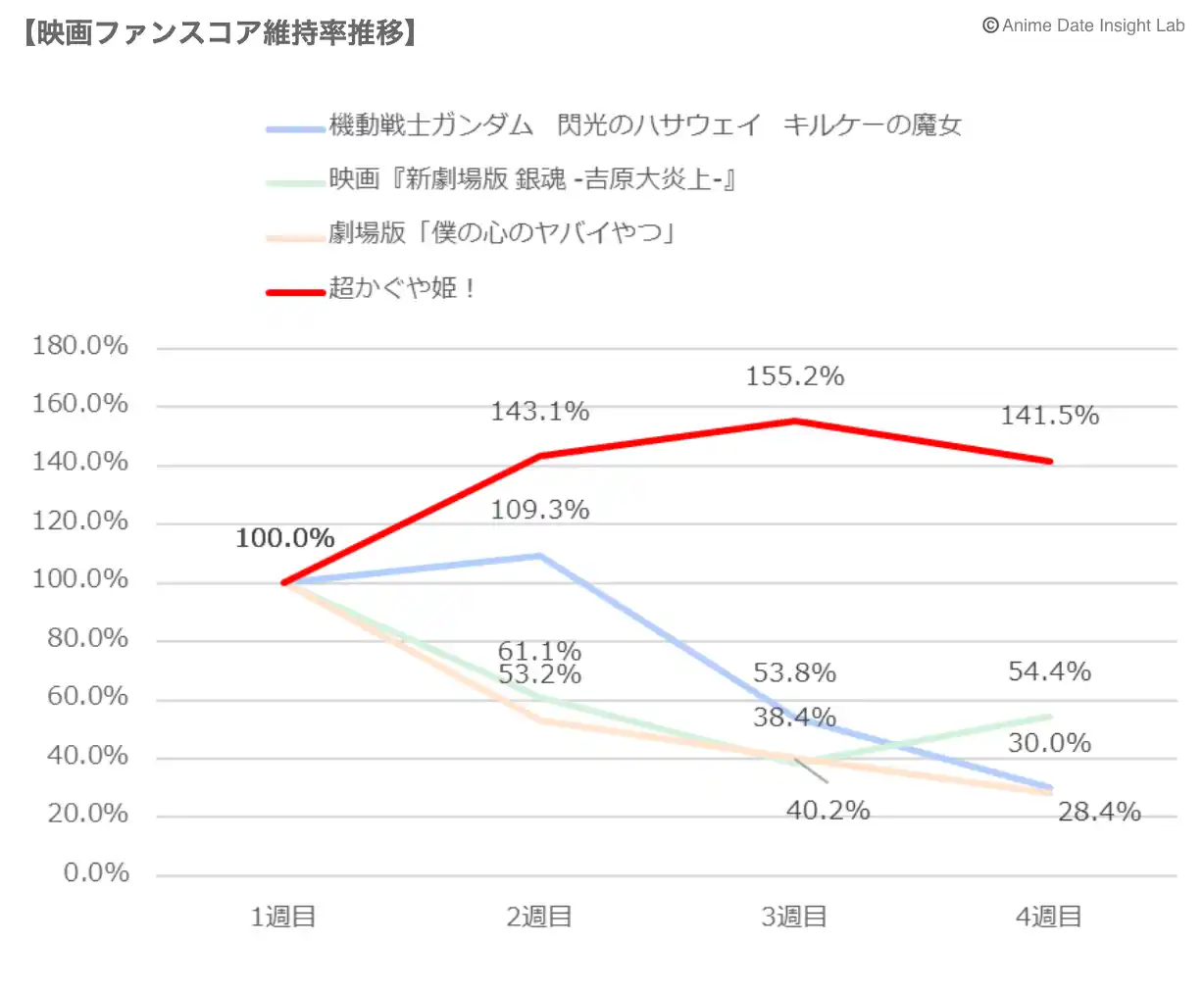 | 通常、劇場アニメのファンスコアは公開週にピークを迎え、その後は減っていく。他の映画もまさにそうだった。 | |||