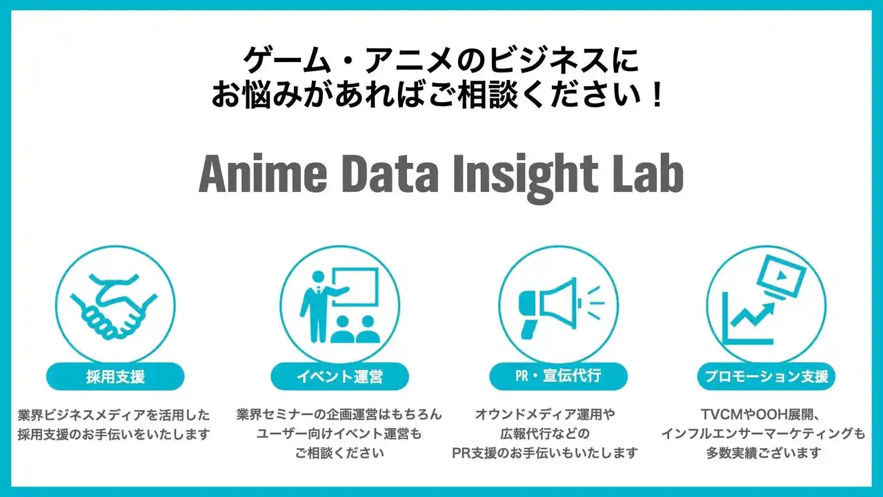 | アニメデータインサイトラボは、アニメ業界のビジネスニュースの発信や情報交換の場を提供していくこととで、アニメ業界のさらなる発展に寄与できるよう目指していきます。 | |||