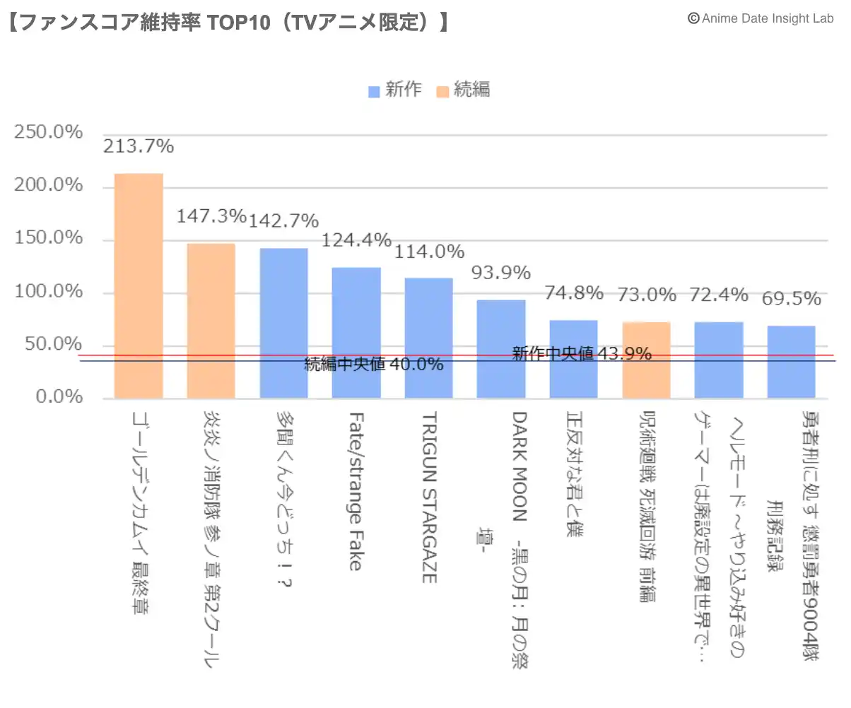| ここで興味深い逆転が起きている。中央値を見ると、新作43.9%に対して続編40.0%。トレンドスコア維持率では続編が新作を上回っていたのに、ファンスコア維持率では新作が逆転した。 | |||