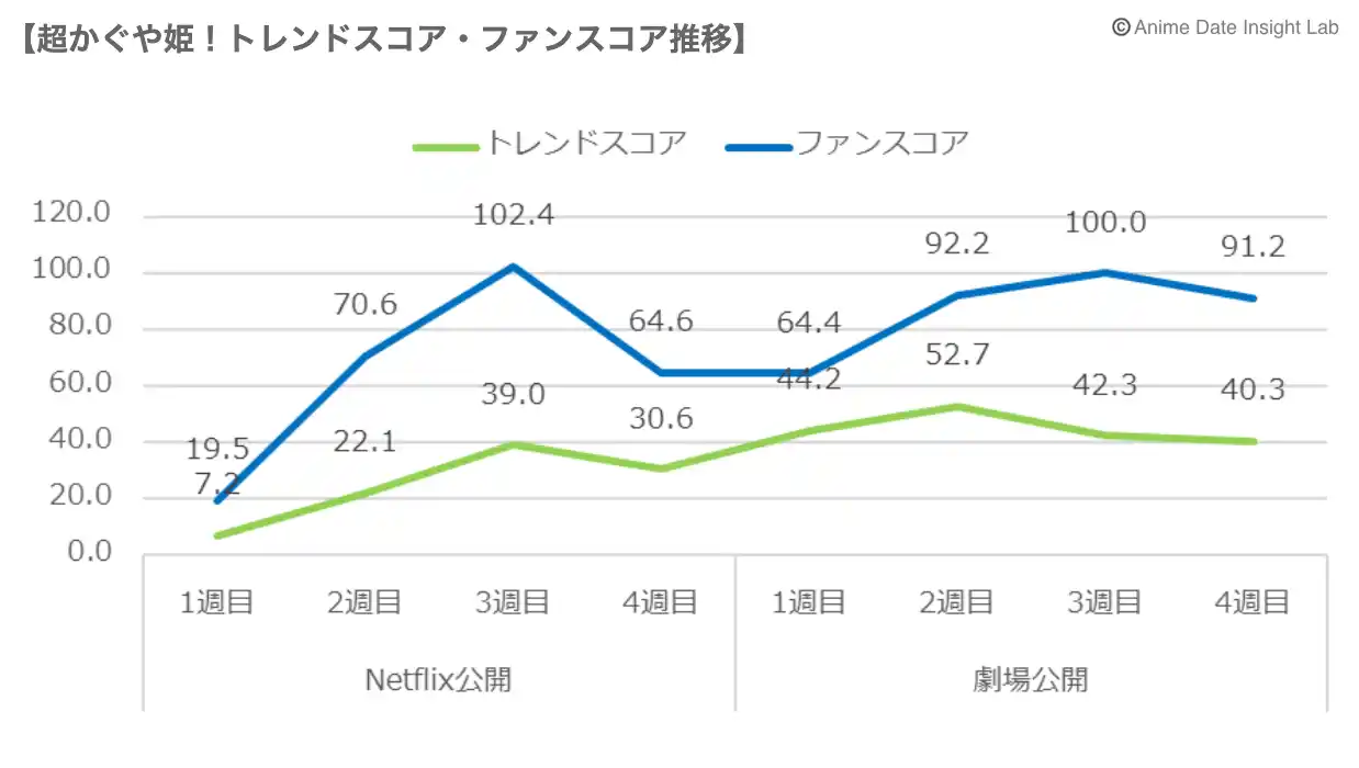| 『超かぐや姫!』はまずNetflixで配信され、ファンスコアは配信1週目19.5→2週目70.6→3週目102.4と急伸した。この時点ですでに「配信だけでも十分に語られた作品」だったが、話題はここで終わらなかった。 | |||