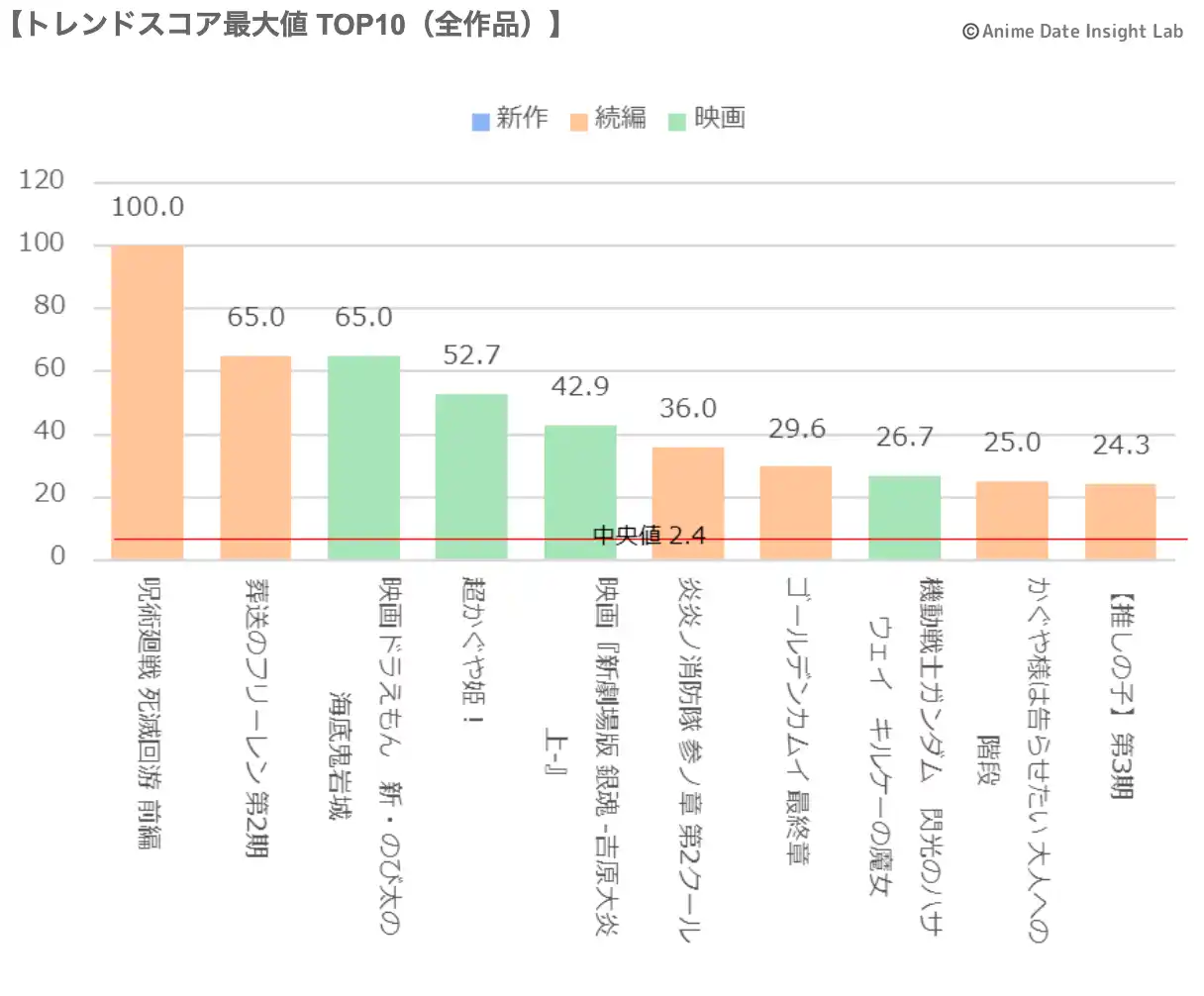 | トレンドスコアの最大値では、『呪術廻戦 死滅回游 前編』が100.0で1位。3週目に記録した数値で、初速からさらに上がった形だ。TOP10中4作品が映画という構成は、今季の劇場アニメの存在感を物語っている。 | |||