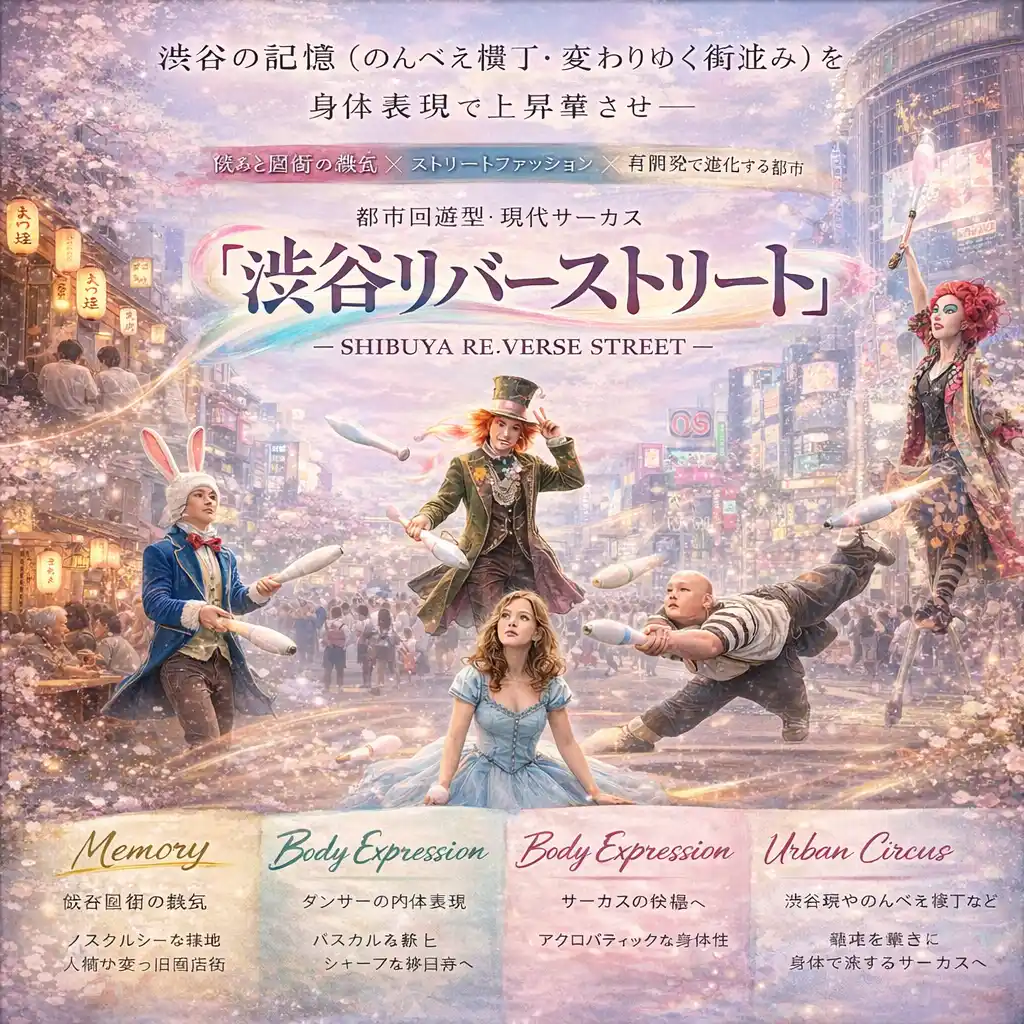 渋谷の「雑多さ」をアクロバットやジャグリングで表現し、童話をオマージュした短編演目を開発。渋谷に眠る歴史や文化を演出に組み込み、「鑑賞する場」から「物語を体感する場」へと塗り替える、非言語の没入型現代サーカスショーを創出します。 |