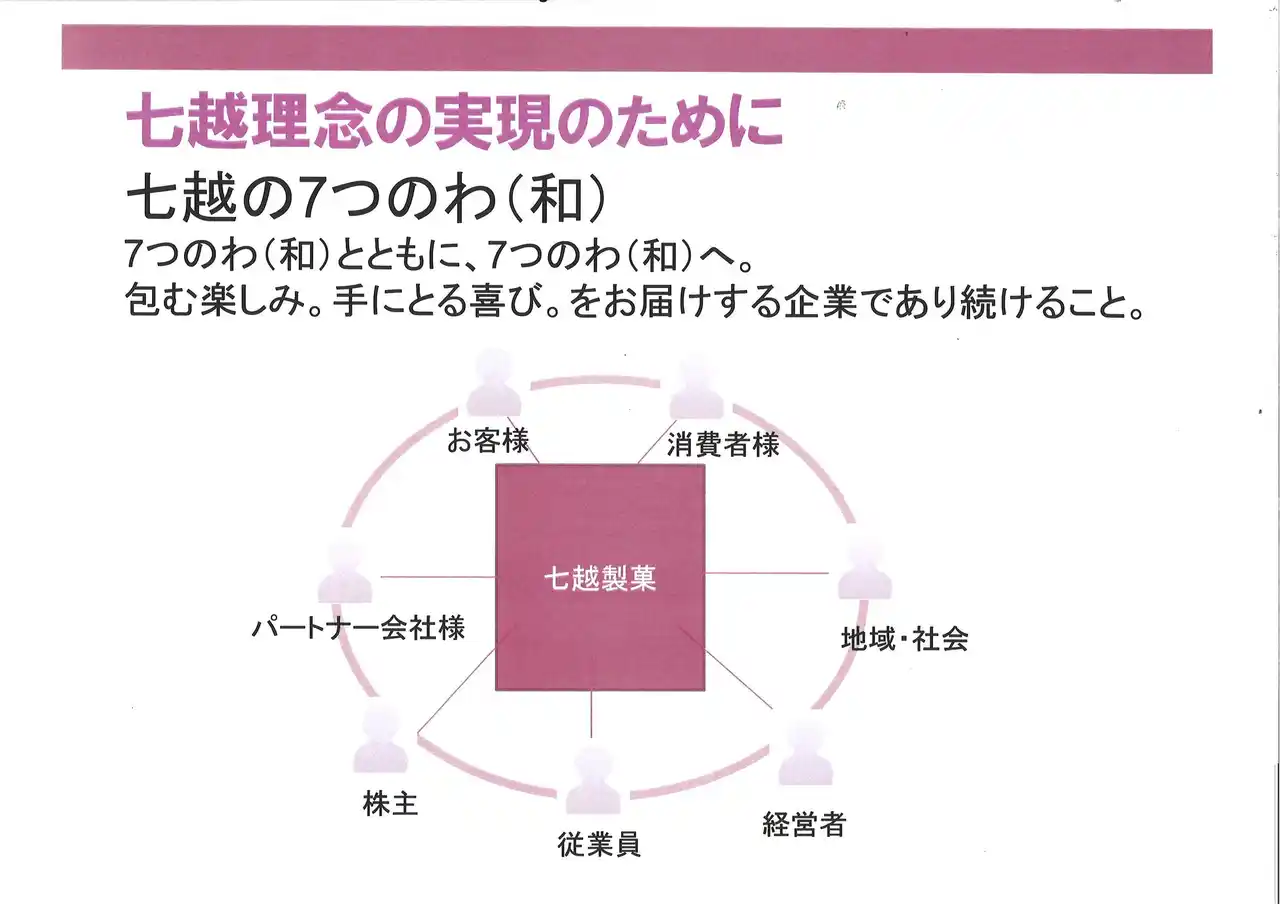 七越製菓の社名は、「縁起のいい“七”をさらに越えた末広がり”八“(の幸福)が皆さま(※)に訪れますように」と願い、創業者 片岡七郎が名付けました。(※)皆さま…七越の7つのわ(和) |