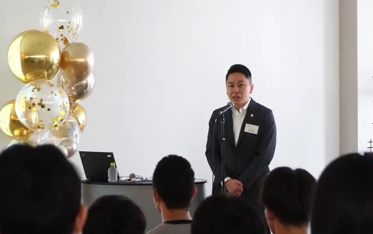 当日は、新入社員と役員、アンバサダーである太田雄貴氏を交えた集合写真の撮影を実施しました。 |