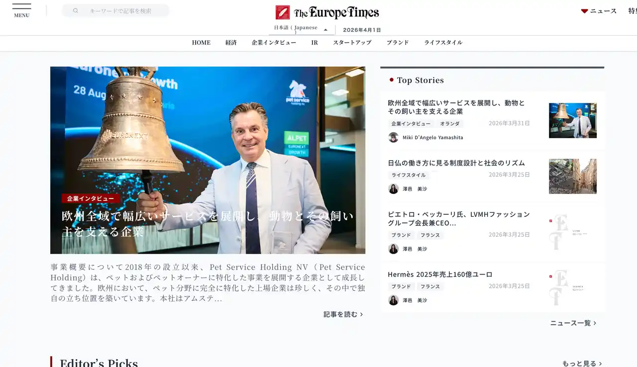 メディア名:The Europe Times 日本語版:https://jp-europe-times.com/ 英語版:https://europe-times.net/ 展開言語:日本語・英語 内容:欧州企業を中心とした人的資本、サステナビリティ、経営思想、独自性、組織・ブランド戦略、ライフスタイル等に関する記事配信 |