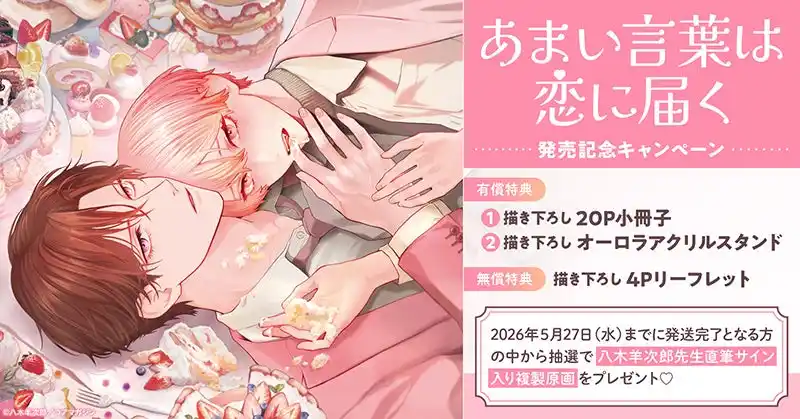 ホーリンラブブックスでは八木羊次郎先生最新コミックス『あまい言葉は恋に届く』発売を記念して、豪華キャンペーンを実施いたします! 貴重な機会にぜひご参加ください!! |
