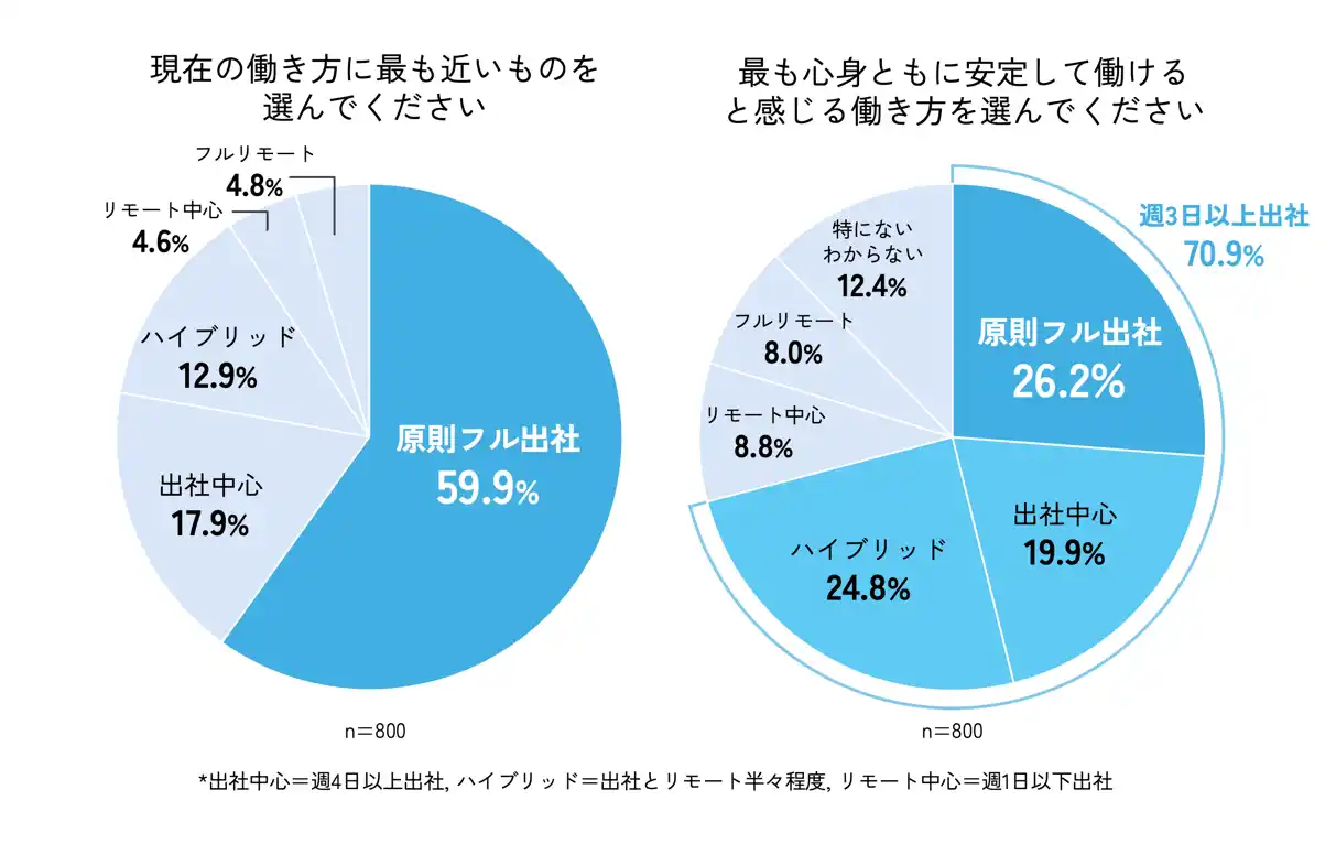 現在の働き方について聞いたところ、全体の59.9%が「フル出社」をしている結果となり、リモート勤務ではなく出社を原則とする企業が過半数であることがわかりました。さらに、「あなたが最も心身ともに安定して働けると感じる働き方」について質問を行ったところ、「週の半分以上はオフィスに出社したい」と考える人が全体の7割以上にのぼり、従業員側の意識においても出社回帰の傾向にあることが明らかになりました。 |