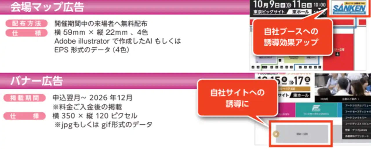 展示会場で来場者がまず手に取る会場マップに、貴社のロゴ・バナーを無料で掲載します。 |