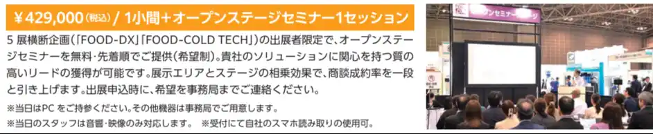 本企画の出展社限定で、会場内のオープンステージにて自社製品やソリューションをPRできるプレゼンテーション枠(30分予定)を無償でご提供します。 課題解決を求める意欲的な来場者(意思決定層)へ、直接自社の強みをアピールし、質の高いマッチングを創出することが可能です。 |