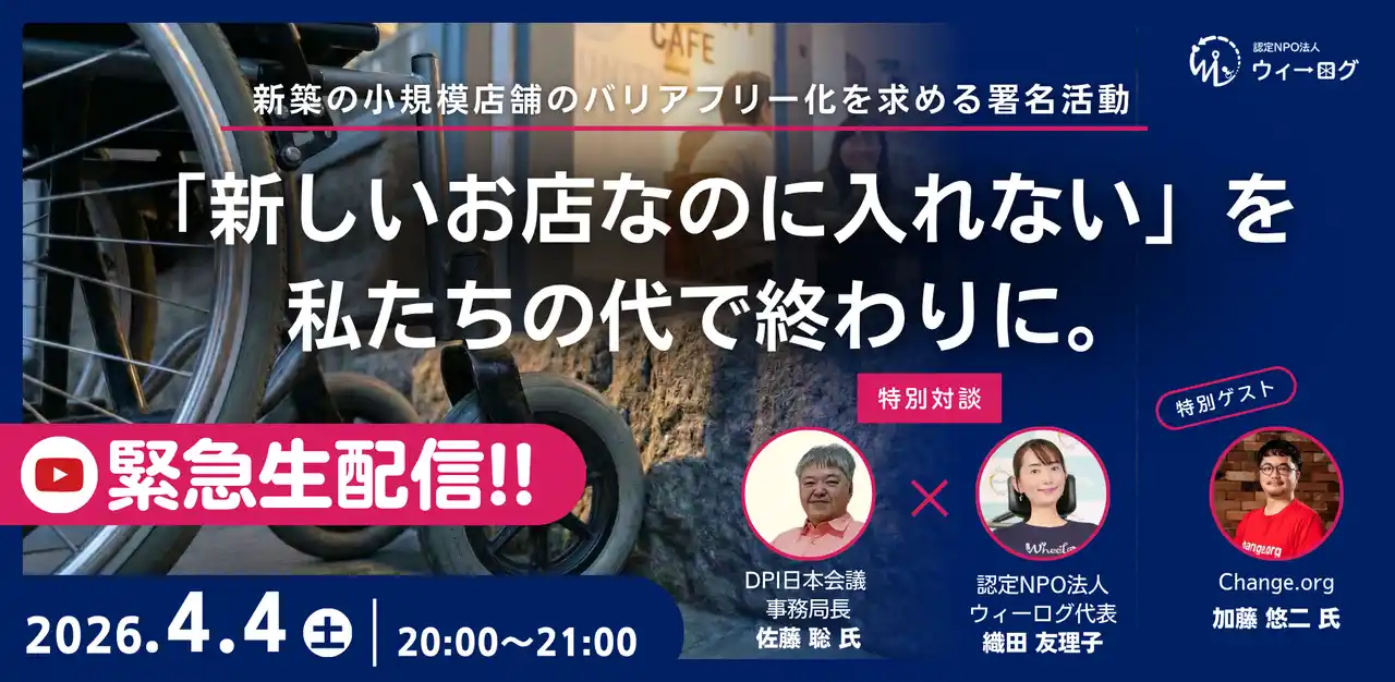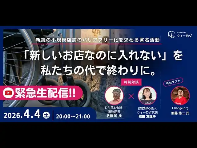 | 車いすでもあきらめない世界をつくる認定特定非営利活動法人ウィーログ(代表理事:織田友理子)は、2026年3月5日より新しく建てるすべての店舗において「段差ゼロ」を標準化することを求める署名活動を開始いたしました。 | |||||||||