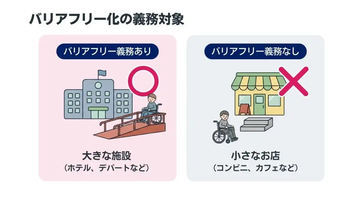 | 現在、日本の建物づくりには「2,000平方メートル (体育館約2面分)の壁」が存在します。大規模な建物にはバリアフリー化が義務付けられていますが、それ未満の店舗(レストランやコンビニ、美容院など)は努力義務となっています。 | |||||||||