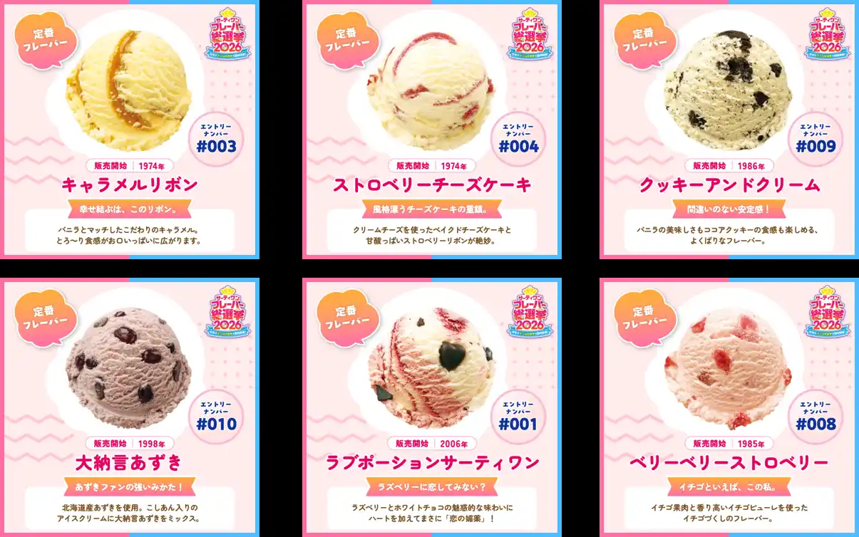 おなじみの定番フレーバーからは、18種類がエントリー。50年以上販売している「キャラメルリボン」や「ストロベリーチーズケーキ」、年間販売数第2位(※2025年タブ出荷本数実績)の「クッキーアンドクリーム」、日本オリジナルの「大納言あずき」、前回のフレーバー総選挙で栄えある1位に輝いた「ラブポーションサーティワン」ももちろんエントリーしています。 |