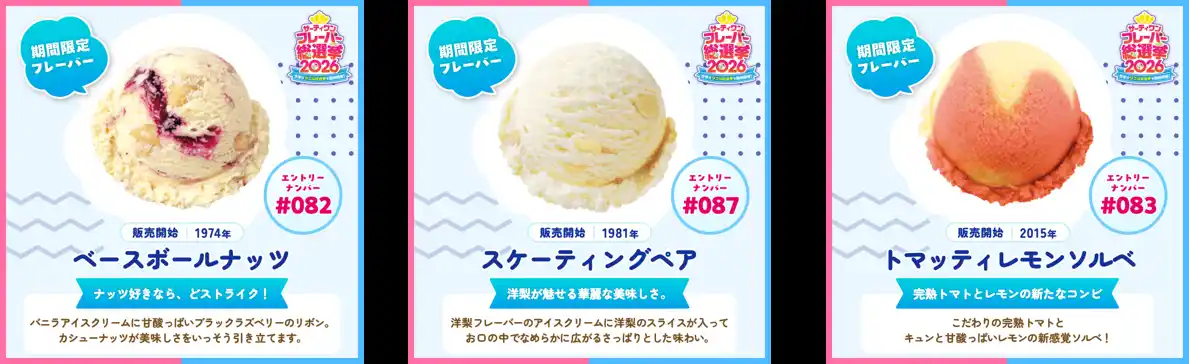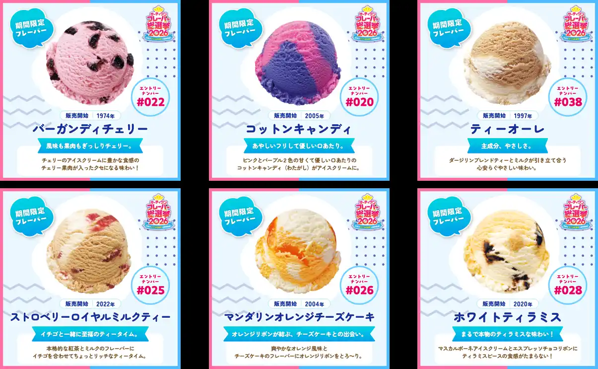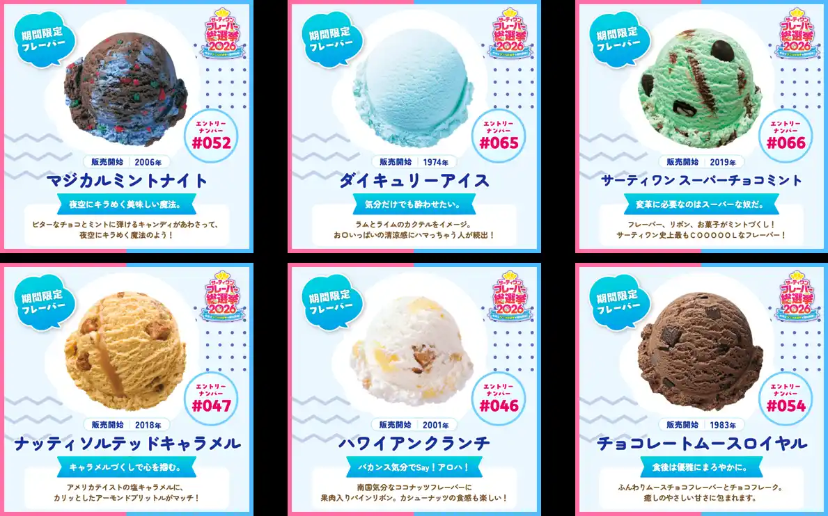 B-R サーティワン アイスクリーム株式会社(所在:東京都品川区上大崎3-1-1/代表取締役会長兼社長 CEO ジョン・キム:東京証券取引所(スタンダード市場):2268)は、2026年4月2日(木)から4月30日(木)まで、「サーティワン フレーバー総選挙2026」を開催します。 |